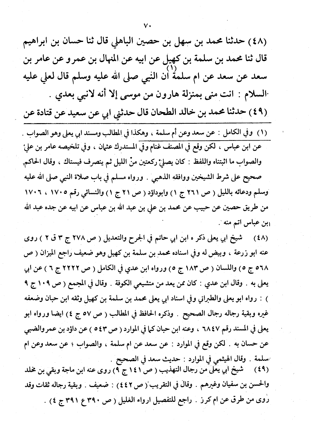 48 - حَدَّثَنَا مُحَمَّدُ بْنُ سَهْلِ بْنِ حُصَيْنٍ الْبَاهِلِيُّ، قَالَ: حَدَّثَنَا حَسَّانُ بْنُ إِبْرَاهِيمَ، قَالَ: حَدَّثَنَا مُحَمَّدُ بْنُ سَلَمَةَ بْنِ كُهَيْلٍ، عَنْ أَبِيهِ، عَنِ الْمِنْهَالِ بْنِ عَمْرٍو، عَنْ عَامِرِ بْنِ سَعْدٍ، عَنْ سَعْدٍ عَنْ أُمِّ سَلَمَةَ، أَنَّ النَّبِيَّ صَلَّى اللهُ عَلَيْهِ وَسَلَّمَ قَالَ لِعَلِيٍّ عَلَيْهِ السَّلَامُ: «§أَنْتَ مِنِّي بِمَنْزِلَةِ هَارُونَ مِنْ مُوسَى، إِلَّا أَنَّهُ لَا نَبِيَّ بَعْدِي»