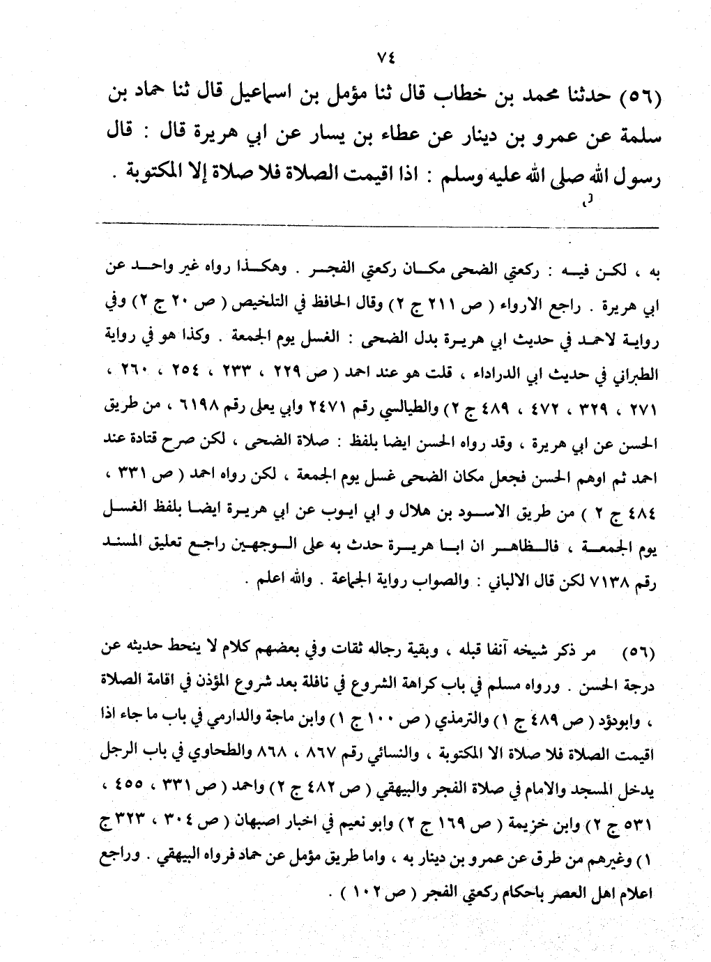 56 - حَدَّثَنَا مُحَمَّدُ بْنُ خَطَّابٍ، قَالَ: حَدَّثَنَا مُؤَمَّلُ بْنُ إِسْمَاعِيلَ، قَالَ: حَدَّثَنَا حَمَّادُ بْنُ سَلَمَةَ، عَنْ عَمْرِو بْنِ دِينَارٍ، عَنْ عَطَاءِ بْنِ يَسَارٍ، عَنْ أَبِي هُرَيْرَةَ، قَالَ: قَالَ رَسُولُ اللَّهِ صَلَّى اللهُ عَلَيْهِ وَسَلَّمَ: «§إِذَا أُقِيمَتِ الصَّلَاةُ، فَلَا صَلَاةَ إِلَّا الْمَكْتُوبَةُ»