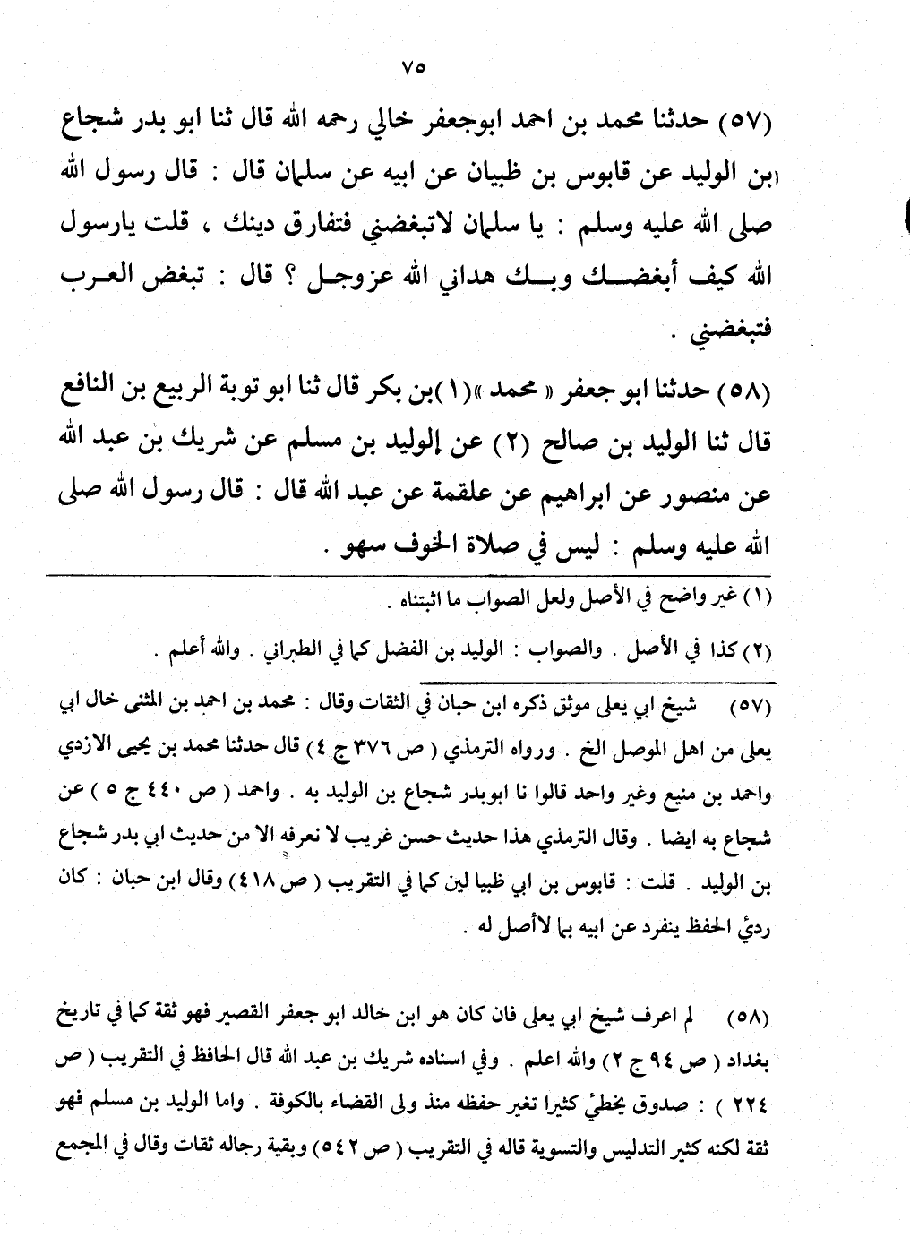 57 - حَدَّثَنَا مُحَمَّدُ بْنُ أَحْمَدَ أَبُو جَعْفَرٍ، خَالِي رَحِمَهُ اللَّهُ قَالَ: حَدَّثَنَا أَبُو بَدْرٍ شُجَاعُ بْنُ الْوَلِيدِ، عَنْ قَابُوسَ بْنِ أَبِي ظَبْيَانَ، عَنْ أَبِيهِ، عَنْ سَلْمَانَ، قَالَ: قَالَ رَسُولُ اللَّهِ صَلَّى اللهُ عَلَيْهِ وَسَلَّمَ: «يَا سَلْمَانُ، §لَا تُبْغِضْنِي؛ فَتُفَارِقَ دِينَكَ» . قُلْتُ: يَا رَسُولَ اللَّهِ، كَيْفَ أُبْغِضُكَ؛ وَقَدْ هَدَانِي اللَّهُ عَزَّ وَجَلَّ؟ قَالَ: «تُبْغِضُ الْعَرَبَ؛ فَتُبْغِضُنِي»
