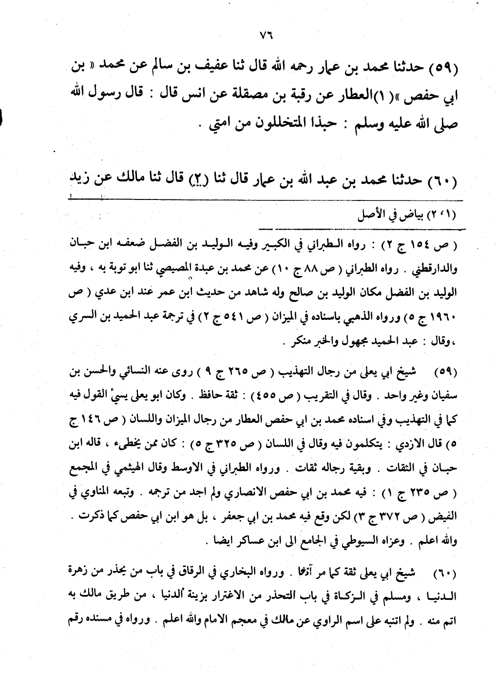 59 - حَدَّثَنَا مُحَمَّدُ بْنُ عَبْدِ اللَّهِ بْنِ عَمَّارٍ، رَحِمَهُ اللَّهُ قَالَ: حَدَّثَنَا عَفِيفُ بْنُ سَالِمٍ، عَنْ مُحَمَّدِ بْنِ أَبِي حَفْصٍ الْعَطَّارِ، عَنْ رَقَبَةَ بْنِ مَسْقَلَةَ، عَنْ أَنَسٍ، قَالَ: قَالَ رَسُولُ اللَّهِ صَلَّى اللهُ عَلَيْهِ وَسَلَّمَ: «§حَبَّذَا الْمُتَخَلِّلُونَ مِنْ أُمَّتِي»