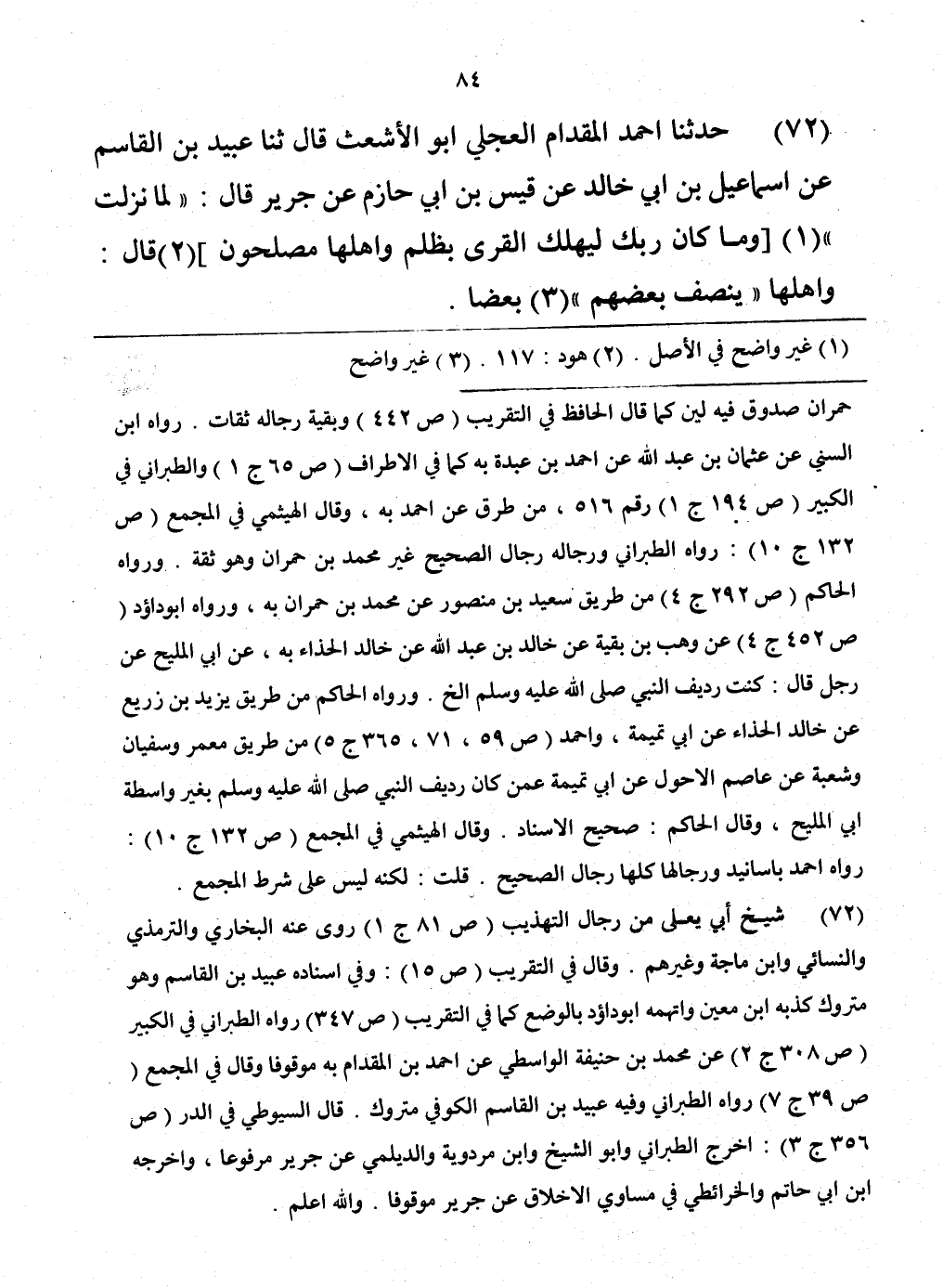 72 - حَدَّثَنَا أَحْمَدُ بْنُ الْمِقْدَامِ الْعِجْلِيُّ أَبُو الْأَشْعَثِ، قَالَ: حَدَّثَنَا عُبَيْدُ بْنُ الْقَاسِمِ، عَنْ إِسْمَاعِيلَ بْنِ أَبِي خَالِدٍ، عَنْ قَيْسِ بْنِ أَبِي حَازِمٍ، عَنْ جَرِيرٍ، قَالَ: " لَمَّا نَزَلَتْ: " {§وَمَا كَانَ رَبُّكَ لِيُهْلِكَ الْقُرَى بِظُلْمٍ وَأَهْلَهَا مُصْلِحُونَ} [هود: 117] قَالَ: «وَأَهْلُهَا يُنْصِفُ بَعْضُهُمْ بَعْضًا»