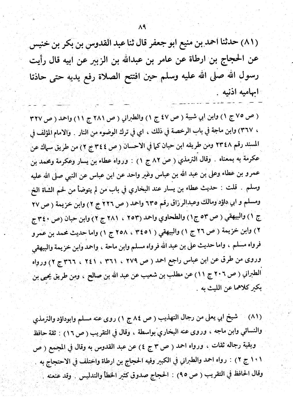 81 - حَدَّثَنَا أَحْمَدُ بْنُ مَنِيعٍ أَبُو جَعْفَرٍ، قَالَ: حَدَّثَنَا عَبْدُ الْقُدُّوسِ بْنُ بَكْرِ بْنِ خُنَيْسٍ، عَنِ الْحَجَّاجِ بْنِ أَرْطَأَةَ، عَنْ عَامِرِ بْنِ عَبْدِ اللَّهِ بْنِ الزُّبَيْرِ، عَنْ أَبِيهِ، قَالَ: «رَأَيْتُ رَسُولَ اللَّهِ صَلَّى اللهُ عَلَيْهِ وَسَلَّمَ §حِينَ افْتَتَحَ الصَّلَاةَ رَفَعَ يَدَيْهِ حَتَّى حَاذَتَا إِبْهَامَيْهِ أُذُنَيْهِ»