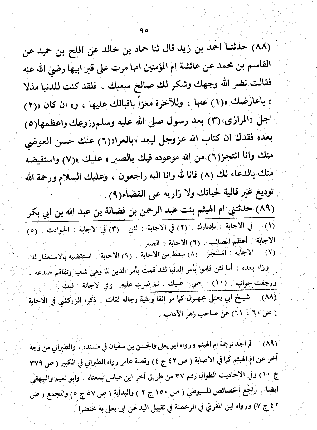 88 - حَدَّثَنَا أَحْمَدُ بْنُ زَيْدٍ، قَالَ: حَدَّثَنَا حَمَّادُ بْنُ خَالِدٍ، عَنْ أَفْلَحَ بْنِ حُمَيْدٍ، عَنِ الْقَاسِمِ بْنِ مُحَمَّدٍ، عَنْ عَائِشَةَ أُمِّ الْمُؤْمِنِينَ، " أَنَّهَا §مَرَّتْ عَلَى قَبْرِ أَبِيهَا رَضِيَ اللَّهُ عَنْهُ، فَقَالَتْ: نَضَّرَ اللَّهُ وَجْهَكَ، وَشَكَرَ لَكَ صَالِحَ سَعْيِكَ، فَلَقَدْ كُنْتَ لِلدُّنْيَا مُذِلًّا؛ بِإِعْرَاضِكَ عَنْهَا، وَلِلْآخِرَةِ مُعِزًّا؛ بِإِقْبَالِكَ عَلَيْهَا، وَإِنْ كَانَ أَجَلَّ الْمَرَازِئِ بَعْدَ رَسُولِ اللَّهِ صَلَّى اللهُ عَلَيْهِ وَسَلَّمَ رُزْؤُكَ، وَأَعْظَمَهَا بَعْدَهُ فَقْدُكَ، إِنَّ كِتَابَ اللَّهِ عَزَّ وَجَلَّ لَيَعِدُ بِالْعَزَاءِ عَنْكَ أَحْسَنَ الْعِوَضِ مِنْكَ، فَأَنَا أَتَنَجَّزُ مِنَ اللَّهِ مَوْعُودَهُ فِيكَ الصَّبْرَ عَلَيْكَ، وَأَسْتَعِيضُهُ مِنْكَ بِالدُّعَاءِ لَكَ، فَإِنَّا لِلَّهِ، وَإِنَّا إِلَيْهِ رَاجِعُونَ، وَعَلَيْكَ السَّلَامُ وَرَحْمَةُ اللَّهِ، تَوْدِيعَ غَيْرِ قَالِيَةٍ لِحَيَاتِكَ، وَلَا زَارِيَةٍ عَلَى الْقَضَاءِ فِيهِ "