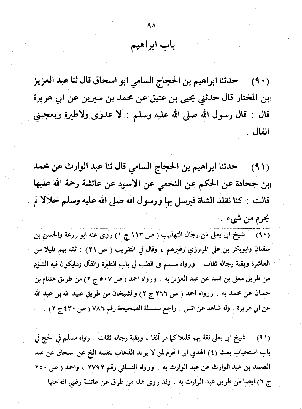 91 - حَدَّثَنَا إِبْرَاهِيمُ بْنُ الْحَجَّاجِ السَّامِيُّ، قَالَ: حَدَّثَنَا عَبْدُ الْوَارِثِ، عَنْ مُحَمَّدِ بْنِ جُحَادَةَ، عَنِ الْحَكَمِ، عَنِ النَّخَعِيِّ، عَنِ الْأَسْوَدِ، عَنْ عَائِشَةَ، رَحْمَةُ اللَّهِ عَلَيْهَا قَالَتْ: «§كُنَّا نُقَلِّدُ الشَّاءَ، فَنُرْسِلُ بِهَا، وَرَسُولُ اللَّهِ صَلَّى اللهُ عَلَيْهِ وَسَلَّمَ حَلَالٌ، لَمْ يُحْرِمْ مِنْ شَيْءٍ»