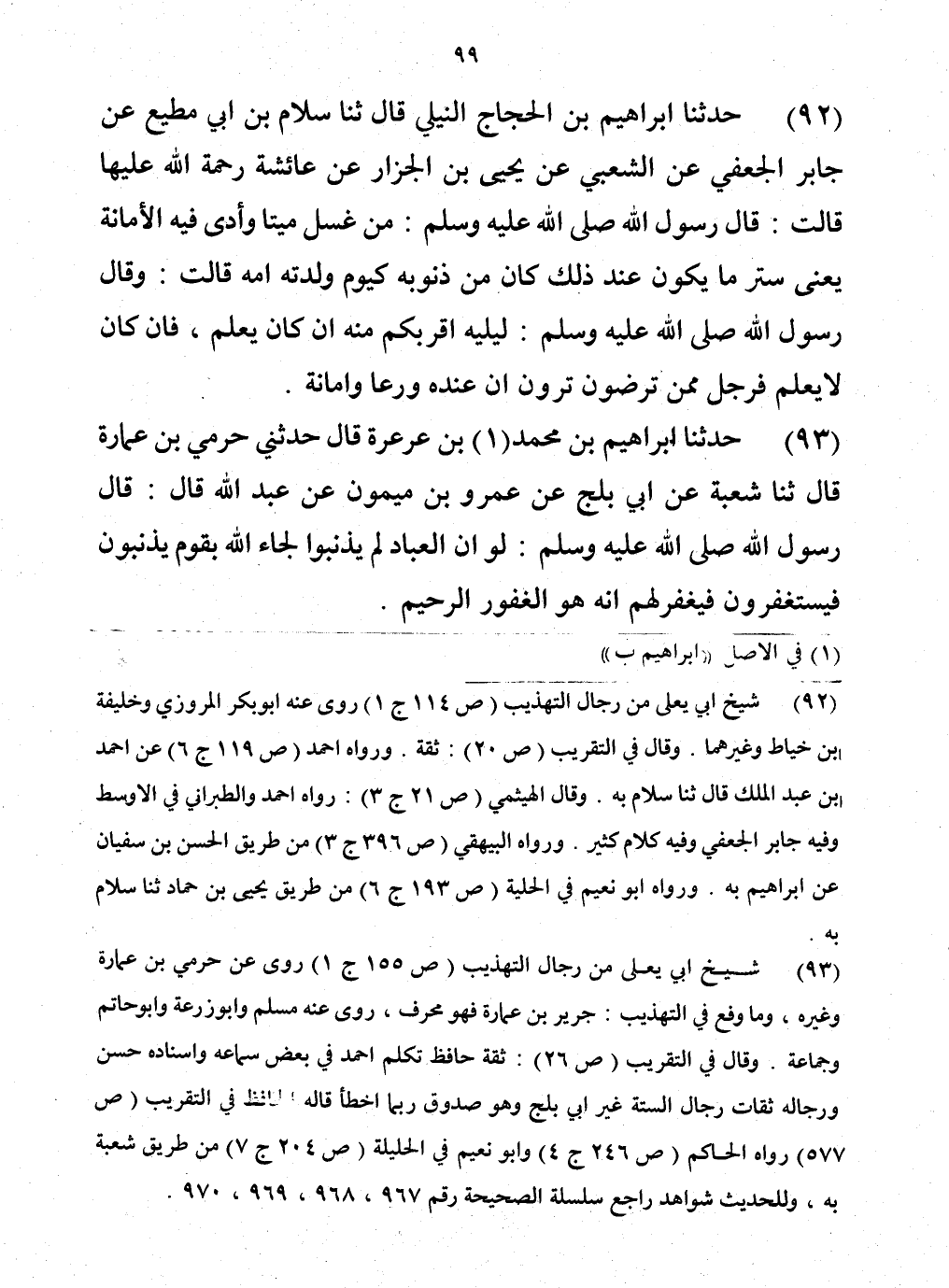 93 - حَدَّثَنَا إِبْرَاهِيمُ بْنُ مُحَمَّدِ بْنِ عَرْعَرَةَ، قَالَ: حَدَّثَنِي حَرَمِيُّ بْنُ عُمَارَةَ، قَالَ: حَدَّثَنَا شُعْبَةُ، عَنْ أَبِي بَلْجٍ، عَنْ عَمْرِو بْنِ مَيْمُونٍ، عَنْ عَبْدِ اللَّهِ، قَالَ: قَالَ رَسُولُ اللَّهِ صَلَّى اللهُ عَلَيْهِ وَسَلَّمَ: «§لَوْ أَنَّ الْعِبَادَ لَمْ يُذْنِبُوا، لَجَاءَ اللَّهُ بِقَوْمٍ يُذْنِبُونَ، فَيَسْتَغْفِرُونَ، فَيَغْفِرُ لَهُمْ، إِنَّهُ هُوَ الْغَفُورُ الرَّحِيمُ»