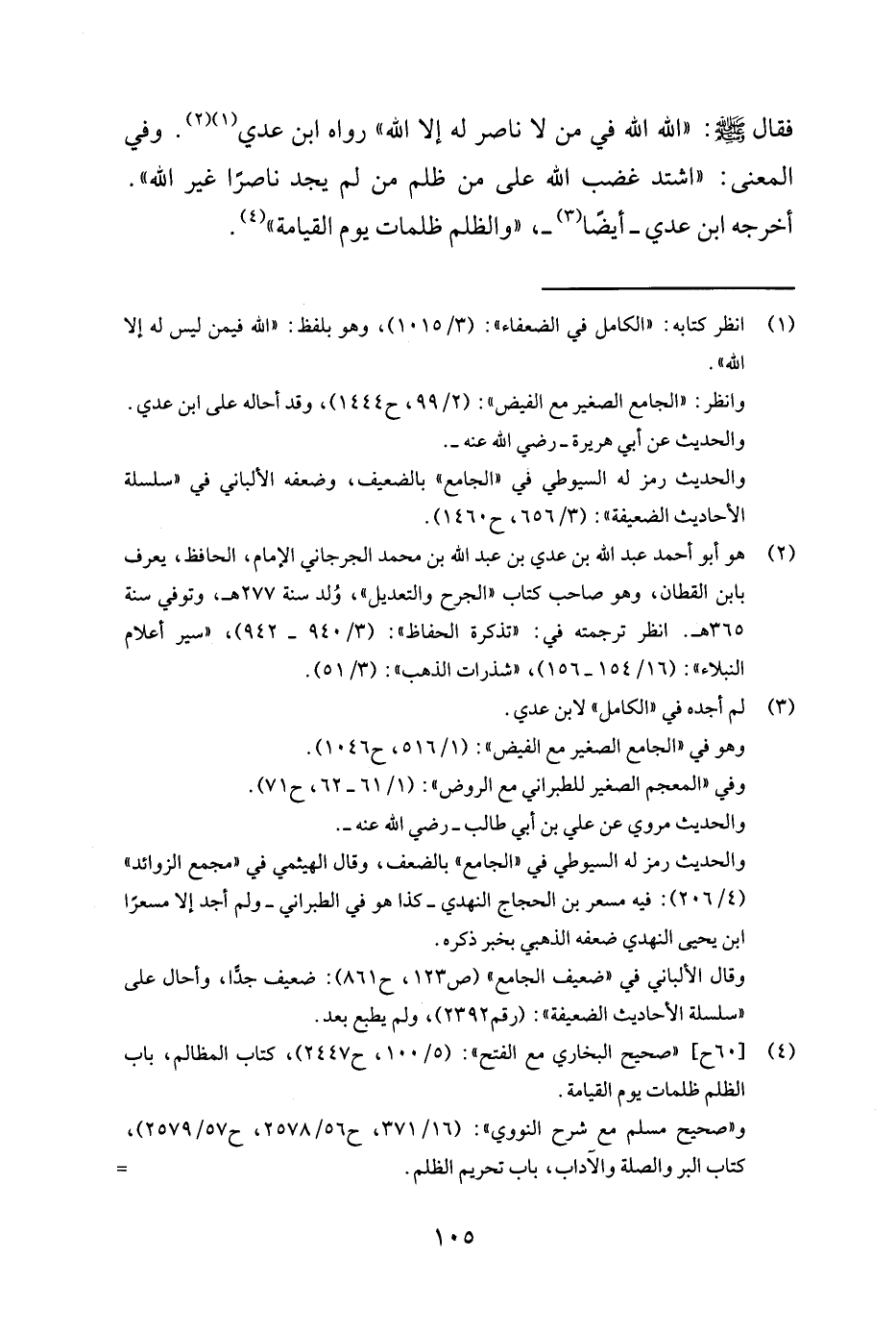 فقال صلى الله عليه وسلم " الله الله في من لا ناصر له إلا الله " رواه ابن عدي.12 وفي المعنى: " اشتد غضب الله على من ظلم من لم يجد ناصرًا غير الله ".