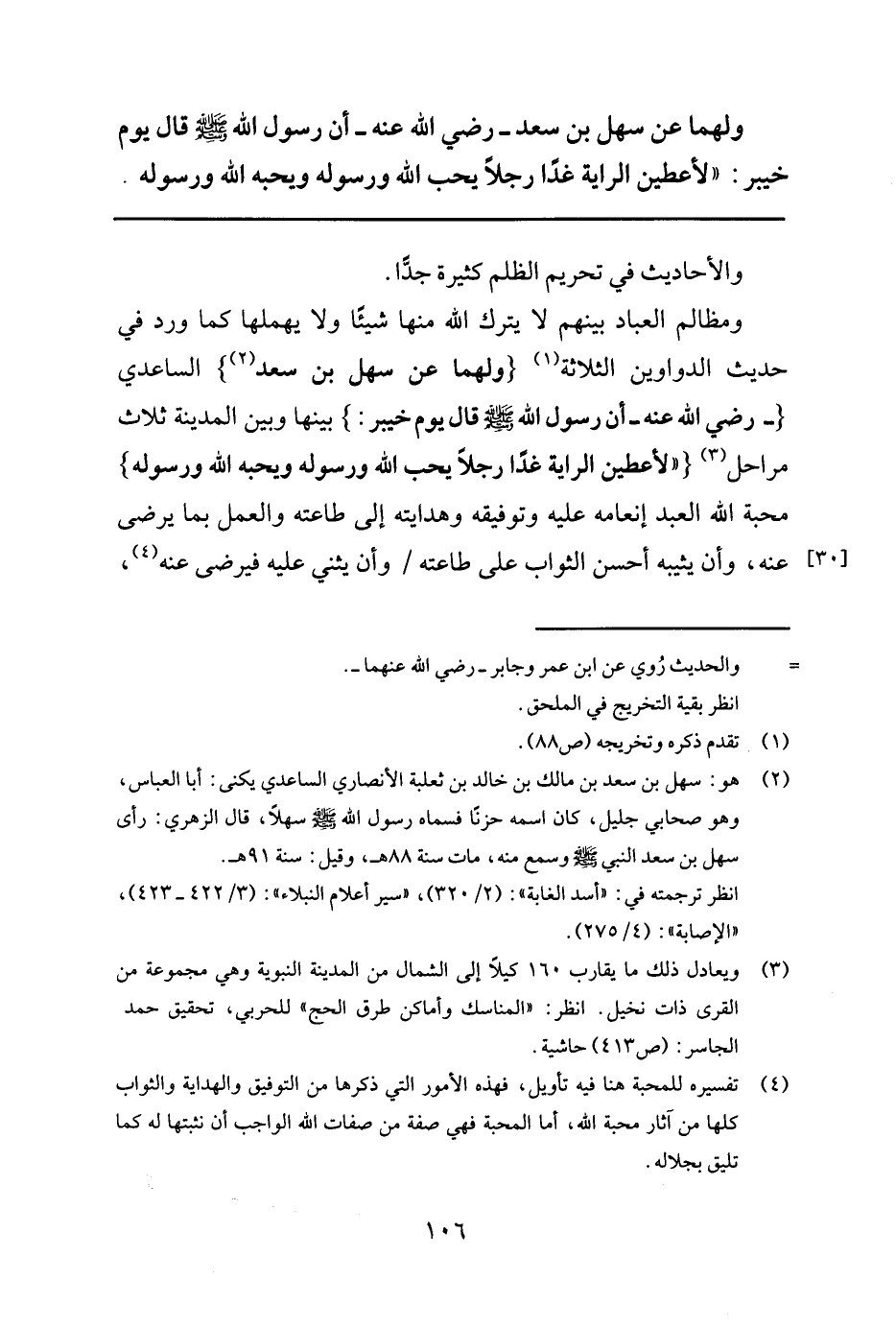 ومظالم العباد بينهم لا يترك الله منها شيئًا ولا يهملها كما ورد في حديث الدواوين الثلاثة1. {ولهما عن سهل بن سعد2} الساعدي {-رضي الله عنه- أن رسول الله صلى الله عليه وسلم قال يوم خيبر:} بينها وبين المدينة ثلاث مراحل3 " لأعطين الراية غدًا رجلا يحب الله ورسوله ويحبه الله ورسوله "4 محبة الله العبد إنعامه عليه وتوفيقه وهدايته إلى طاعته والعمل بما يرضى عنه، وأن يثيبه أحسن الثواب على طاعته / وأن يثني عليه فيرضى عنه5،