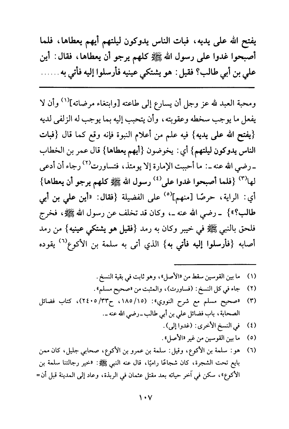 ومحبة العبد لله عز وجل أن يسارع إلى طاعته [وابتغاء مرضاته] ،1 وأن لا يفعل ما يوجب سخطه وعقوبته، وأن يتحبب إليه بما يوجب له الزلفى لديه {يفتح الله على يديه} فيه علم من أعلام النبوة فإنه وقع كما قال {فبات الناس يدوكون ليلتهم} أي: يخوضون {أيهم يعطاها} قال عمر بن الخطاب رضي الله عنه " ما أحببت الإمارة إلا يومئذ، فتساورت2 رجاء أن أدعى لها3 " {فلما أصبحوا غدوا على4 رسول الله صلى الله عليه وسلم كلهم يرجو أن يعطاها} أي: الراية، حرصا [منهم] ،5 على الفضيلة {فقال: "أين علي بن أبي طالب؟ "} رضي الله عنه وكان قد تخلف عن رسول الله صلى الله عليه وسلم فخرج فلحق بالنبي صلى الله عليه وسلم في خيبر وكان به رمد {فقيل هو يشتكي عينيه} من رمد أصابه {فأرسلوا إليه فأتي به} الذي أتى به سلمة بن الأكوع6 يقوده