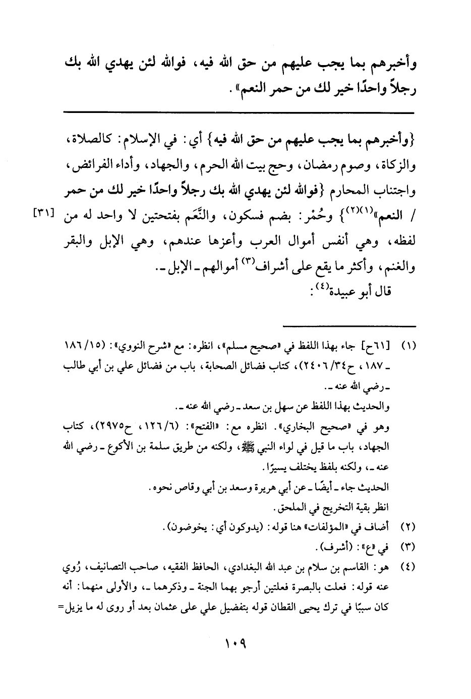 وأخبرهم بما يجب عليهم من حق الله فيه، فوالله لئن يهدي الله بك رجلاً واحدًا خير لك من حمر النعم "1.
