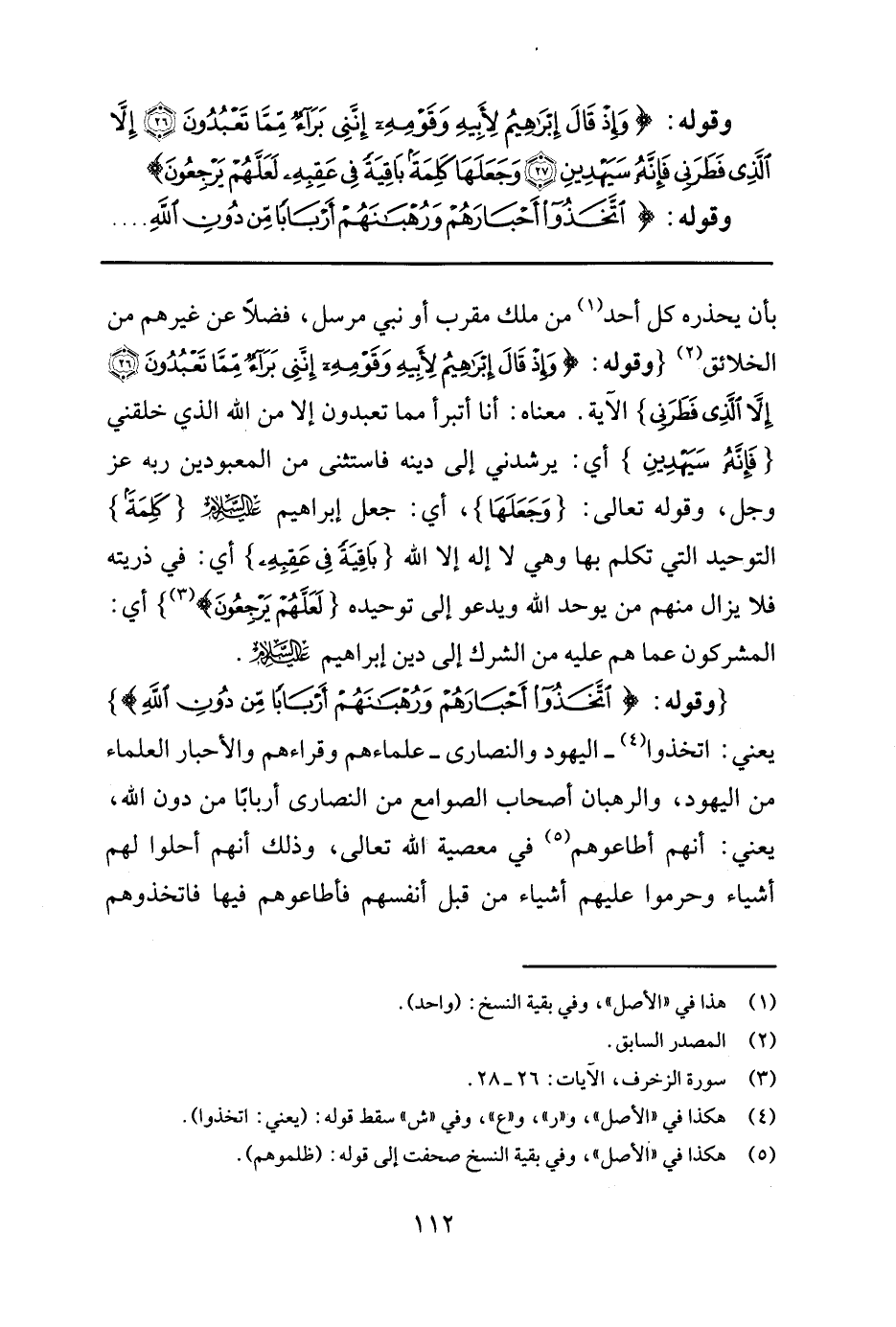 بأن يحذره كل أحد2 من ملك مقرب أو نبي مرسل، فضلا عن غيرهم من الخلائق3 {وقوله:: {وَإِذْ قَالَ إِبْرَاهِيمُ لأَبِيهِ وَقَوْمِهِ إِنَّنِي بَرَاءٌ مِمَّا تَعْبُدُونَ إِلاَّ الَّذِي فَطَرَنِي} 4} الآية معناه: أنا أتبرأ مما تعبدون إلا من الله الذي خلقني {فَإِنَّهُ سَيَهْدِين} ِ 5} أي: يرشدني إلى دينه فاستثنى من المعبودين ربه عز وجل وقوله تعالى: {وَجَعَلَهَا} أي: جعل إبراهيم عليه السلام.