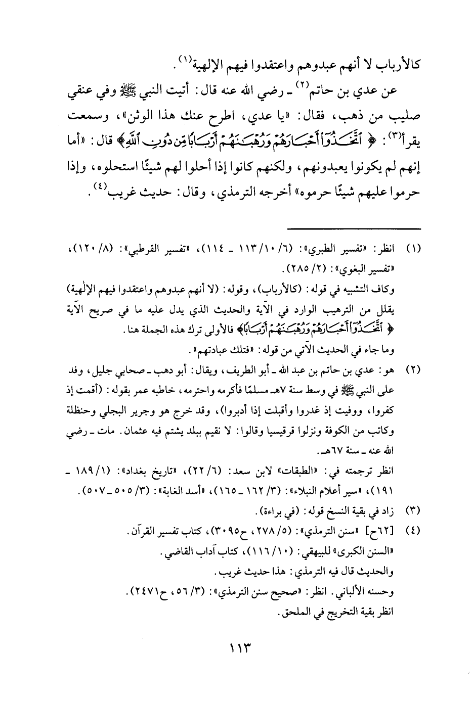 (1) انظر: ((تفسير الطبري)) : (6/10/133-114) , ((تفسير القرطبي)) : (8/120) , ((تفسير البغوي)) : (2/285) . وكاف التشبيه في قوله: (كالأرباب) , وقوله: (لا أنهم عبدوهم واعتقدوا فيهم الإلهية) يقلل من الترهيب الوارد في ال، الآية والحديث الذي يدل عليه ما في صريح ال، الآية {اتَّخَذُوا أَحْبَارَهُمْ وَرُهْبَانَهُمْ أَرْبَاباً مِنْ دُونِ اللَّهِ} فالأولى ترك هذه الجملة هنا. وما جاء في الحديث الآتي من قوله: ((فتلك عبادتهم)) .