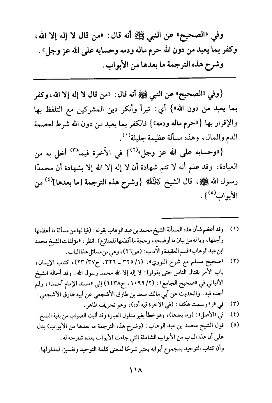 (3) وقد أعظم شأن هذه المسألة الشيخ محمد بن عبد الوهاب بقوله: (فيا لها من مسألة ما أعظمها وأجلها, ويا له من بيان ما أوضحه, وحجة ما أقطعها للمنازع) . انظر: ((مؤلفات الشيخ محمد ابن عبد الوهاب)) قسم العقيدة والآداب: (ص 26) , وهي من مسائل هذا الباب.