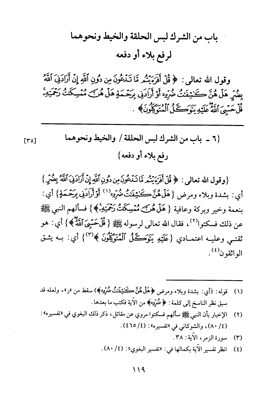 {6- باب من الشرك لبس الحلقة والخيط ونحوهما رفع بلاء أو دفعه}