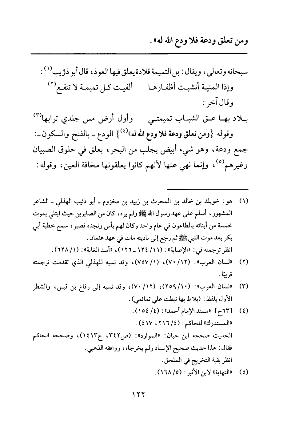 وقوله "ومن تعلق ودعة فلا ودع الله له 5 " الوَدْع -بالفتح والسكون-: جمع ودعة، وهو شيء أبيض يجلب من البحر، يعلق في حلوق الصبيان وغيرهم،6 وإنما نهي عنها لأنهم كانوا يعلقونها مخافة العين، وقوله: