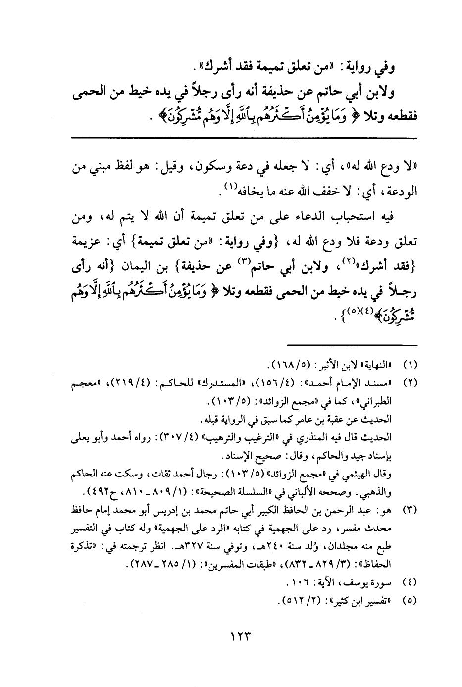فيه استحباب الدعاء على من تعلق تميمة أن الله لا يتم له، ومن تعلق ودعة فلا ودع الله له، {وفي رواية: " من تعلق تميمة} أي: عزيمة {فقد أشرك "،4 ولابن أبي حاتم5 عن حذيفة} بن اليمان {أنه رأى رجلاً في يده خيط من الحمى فقطعه وتلا {وَمَا يُؤْمِنُ أَكْثَرُهُمْ بِاللَّهِ إِلاَّ وَهُمْ مُشْرِكُونَ} 6} 7.