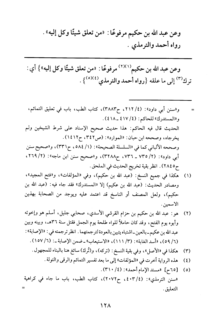 (7) [65 ح] ((مسند الإمام أحمد)) : (4/310) . ((سنن الترمذي)) : (4/403, ح 2072) , كتاب الطب, باب ما جاء في كراهية التعليق. ((مستدرك الحاكم)) : (4/216) , كتاب الطب, والراوي عبد الله بن حكيم -بالحاء-. والحديث سكت عنه الحاكم والذهبي. وذكر الترمذي أن عبد الله بن عكيم لم يسمع من النبي صلى الله عليه وسلم. وحسنه الألباني بشاهد له. انظر: ((صحيح سنن الترمذي)) , (2/208, ح 1691) . انظر بقية التخريج في الملحق.