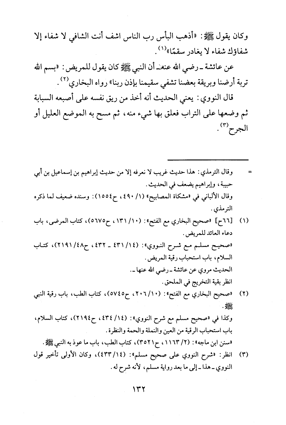 عن عائشة -رضي الله عنها- أن النبي صلى الله عليه وسلم كان يقول للمريض: " بسم الله تربة أرضنا وبريقة بعضنا تشفي سقيمنا بإذن ربنا "3 رواه البخاري4.