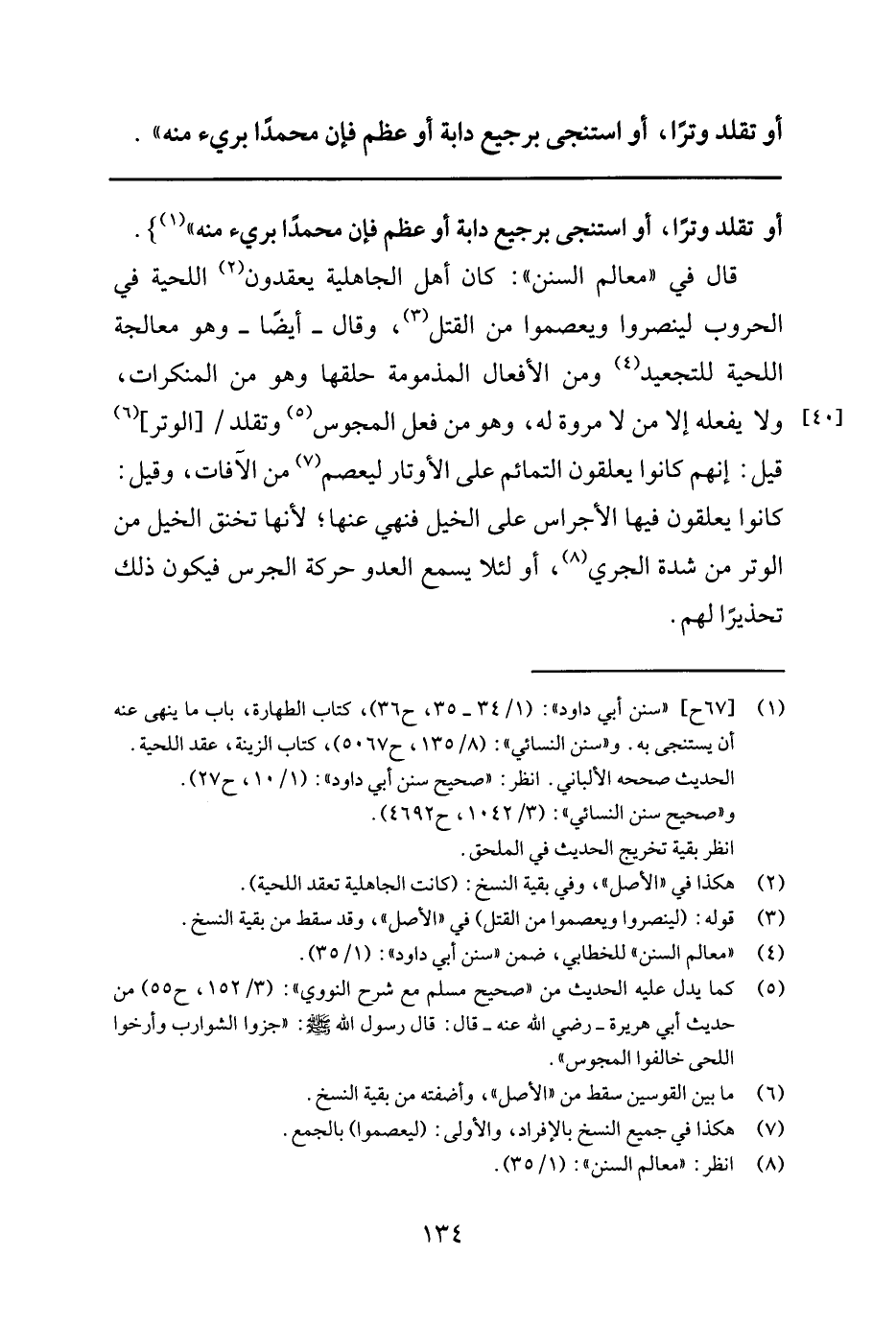 (2) [67 ح] ((سنن أبي داود)) : (1/34-35, ح 36) , كتاب الطهارة, باب ما ينهى عنه أن يستنجى به. و ((سنن النسائي)) : (8/135, ح 5067) , كتاب الزينة, عقد اللحية. الحديث صححه الألباني. انظر: ((صحيح سنن أبي داود)) : (1/10, ح 27) . و ((صحيح سنن النسائي)) : (3/1042, ح 4692) . انظر بقية تخريج الحديث في الملحق.