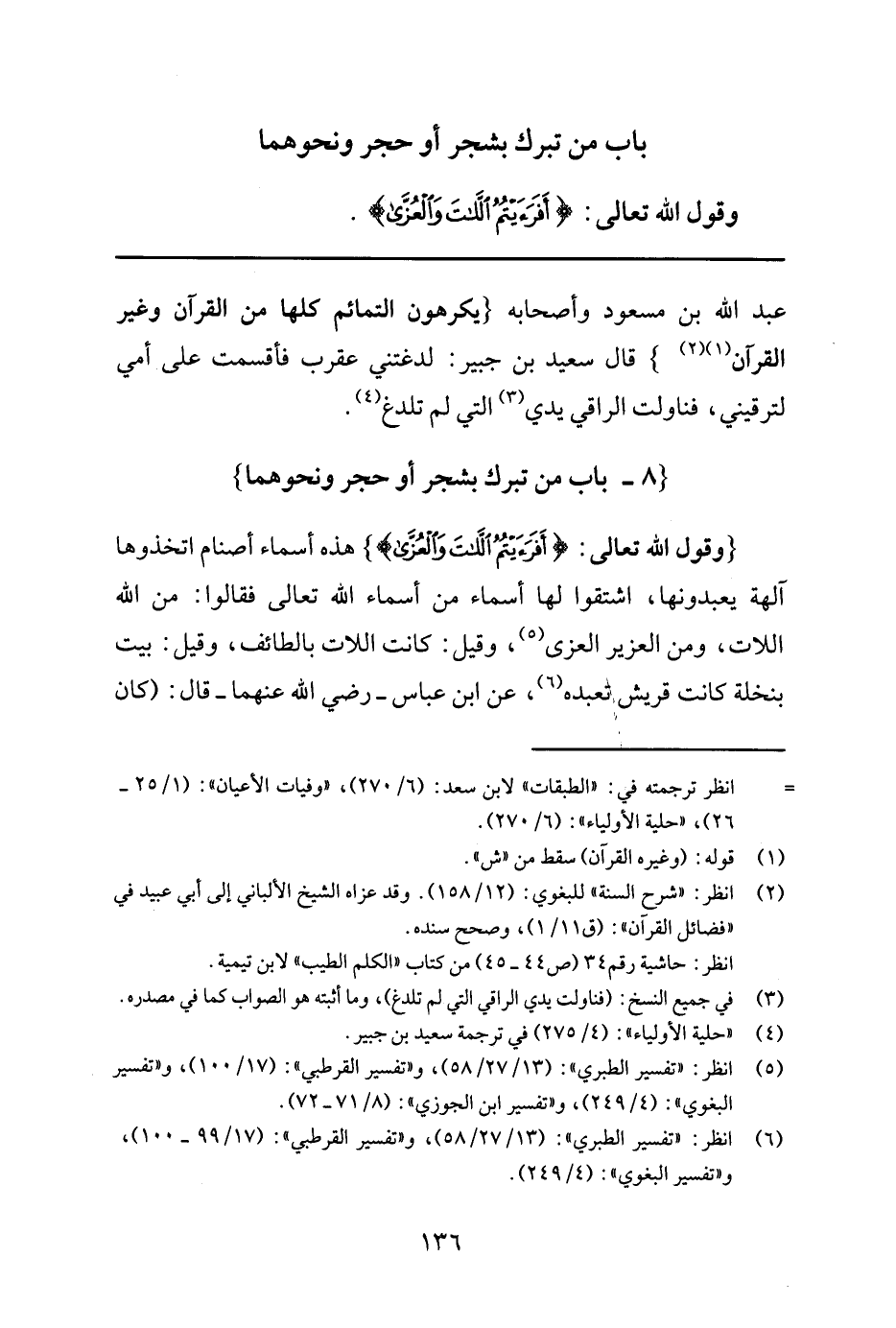 {وقول الله تعالى: {أَفَرَأَيْتُمُ اللَّاتَ وَالْعُزَّى} 5} هذه أسماء أصنام اتخذوها آلهة يعبدونها، اشتقوا لها أسماء من أسماء الله تعالى فقالوا: من الله اللات، ومن العزير العزى،6 وقيل: كانت اللات بالطائف، وقيل: بيت بنخلة كانت قريش تعبده،7 عن ابن عباس -رضي الله عنهما- قال: (كان