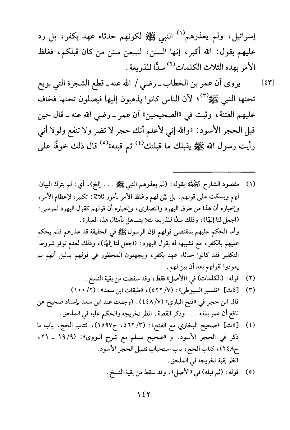 إسرائيل، ولم يعذرهم1 النبي صلى اله عليه وسلم لكونهم حدثاء عهد بكفر، بل رد عليهم بقول: الله أكبر، إنها السنن، لتتبعن سنن من كان قبلكم، فغلظ الأمر بهذه الثلاث الكلمات2 سدا للذريعة.