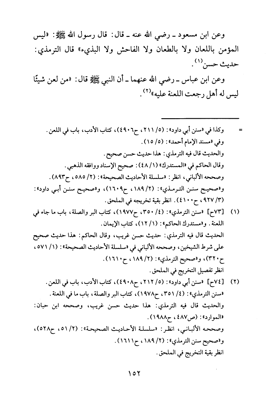 (2) [73 ح] ((سنن الترمذي)) : (4/350, ح 1977) , كتاب البر والصلة, باب ما جاء في اللعنة. و ((مستدرك الحاكم)) : (1/12) , كتاب الإيمان. الحديث قال فيه الترمذي: حديث حسن غريب, وقال الحاكم: هذا حديث صحيح على شرط الشيخين, وصححه الألباني في ((سلسلة الأحاديث الصحيحة)) : (1/571, ح 320) , و ((صحيح الترمذي)) : (2/189, ح 1610) .