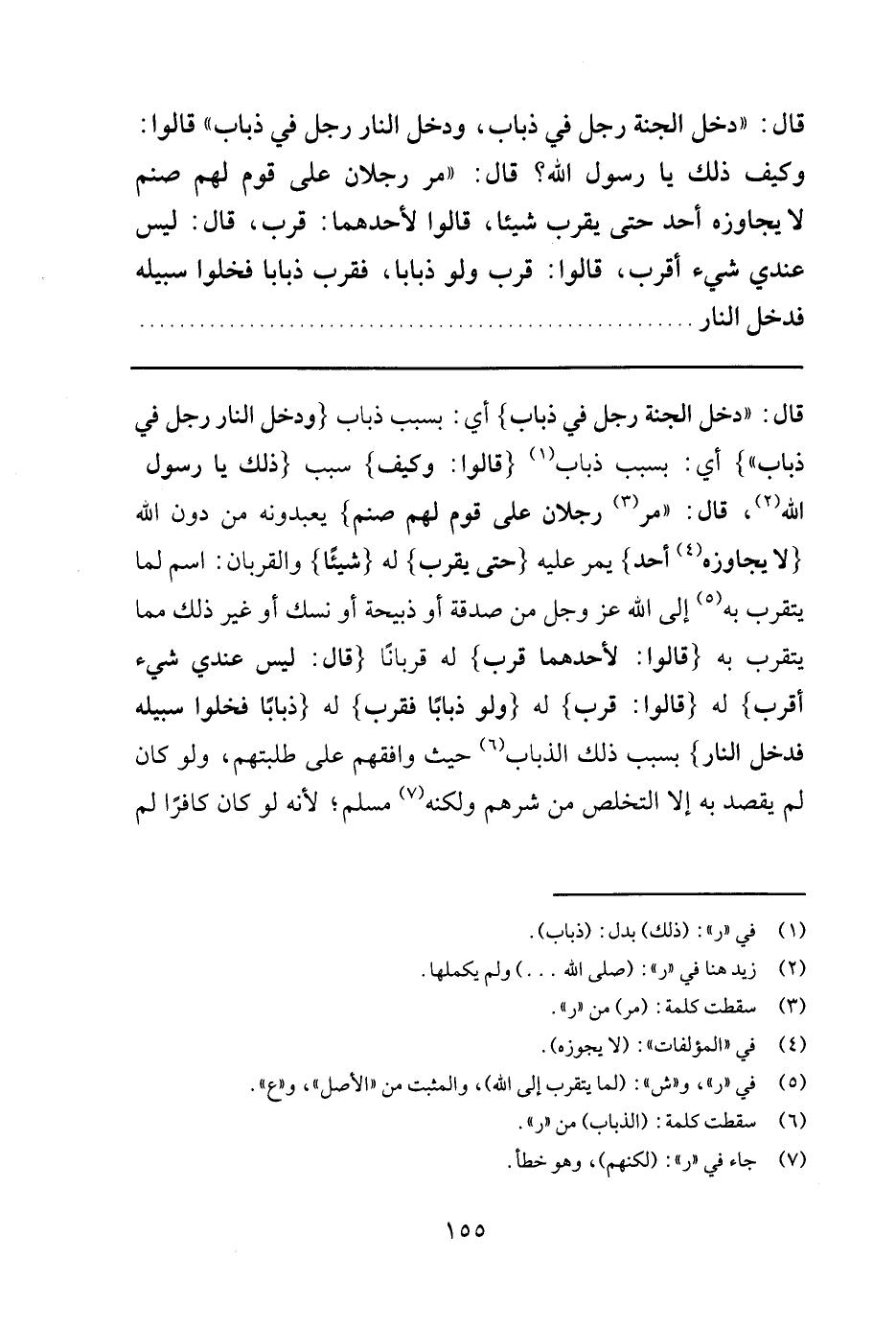 قال: {" دخل الجنة رجل في ذباب "} أي: بسبب ذبابًا {ودخل النار رجل في ذباب "} أي: بسبب ذباب1 {قالوا: وكيف} سبب {ذلك يا رسول الله2، قال: "مر3 رجلان على قوم لهم صنم} يعبدونه من دون الله {لا يجاوزه4 أحد} يمر عليه {حتى يقرب} له {شيئًا} والقربان: اسم لما يتقرب به5 إلى الله عز وجل من صدقة أو ذبيحةذ أو نسك أو غير ذلك مما يتقرب به {قالوا: لأحدهما قرب} له قربانًا {قال: ليس عندي شيء أقرب} له {قالوا: قرب} له {ولو ذبابًا فقرب} له {فخلوا سبيله فدخل النار} بسبب ذلك الذباب6 حيث وافقهم على طلبتهم، ولو كان لم يقصد به إلا التخلص من شرهم ولكنه7 مسلم; لأنه لو كان كافرًا لم