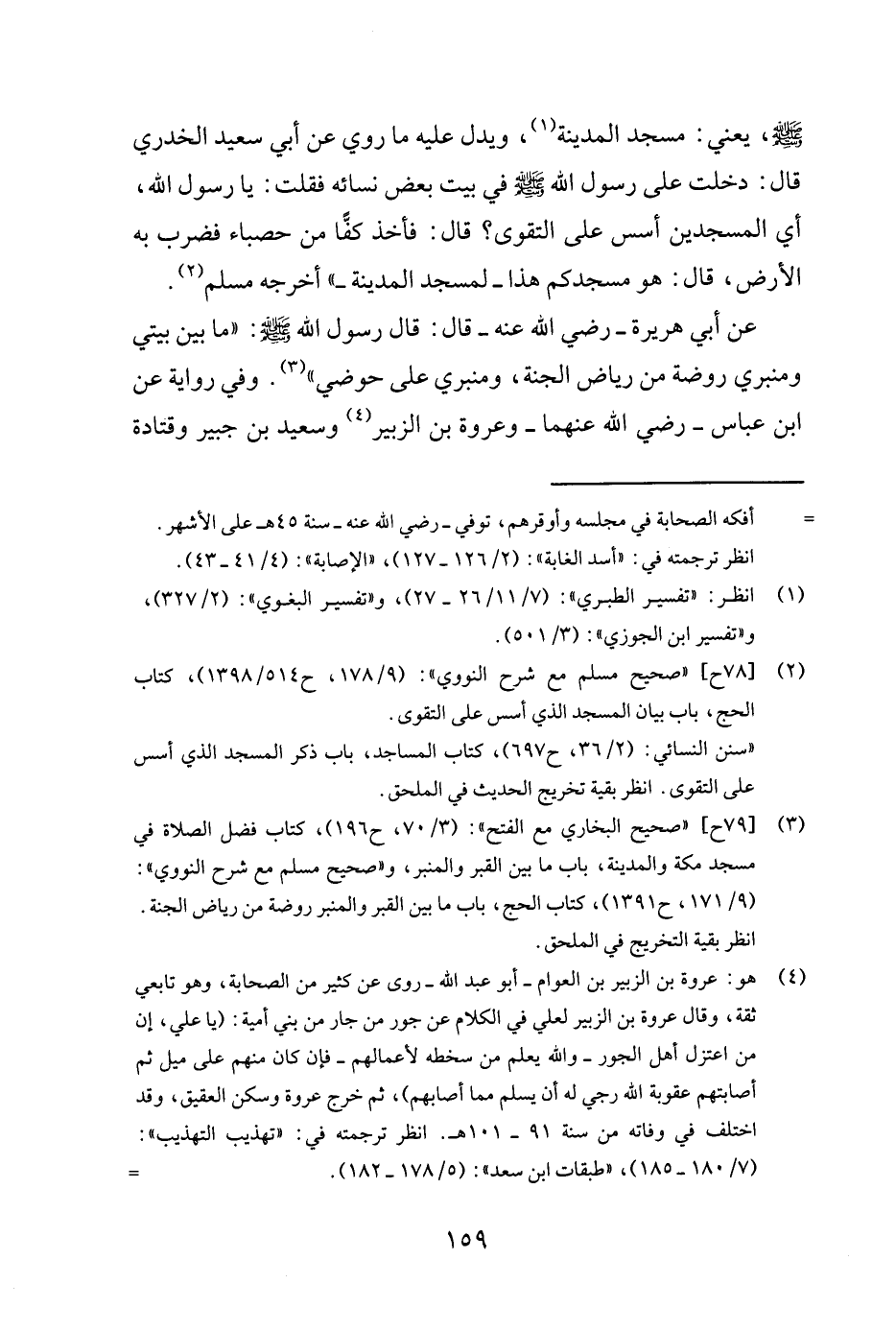 (3) [78 ح] ((صحيح مسلم مع شرح النووي)) : (9/178, ح 514/1398) , كتاب الحج, باب بيان المسجد الذي أسس على التقوى. ((سنن النسائي)) : (2/36, ح 697) , كتاب المساجد, باب ذكر المسجد الذي أسس على التقوى. انظر بقية تخريج الحديث في الملحق.