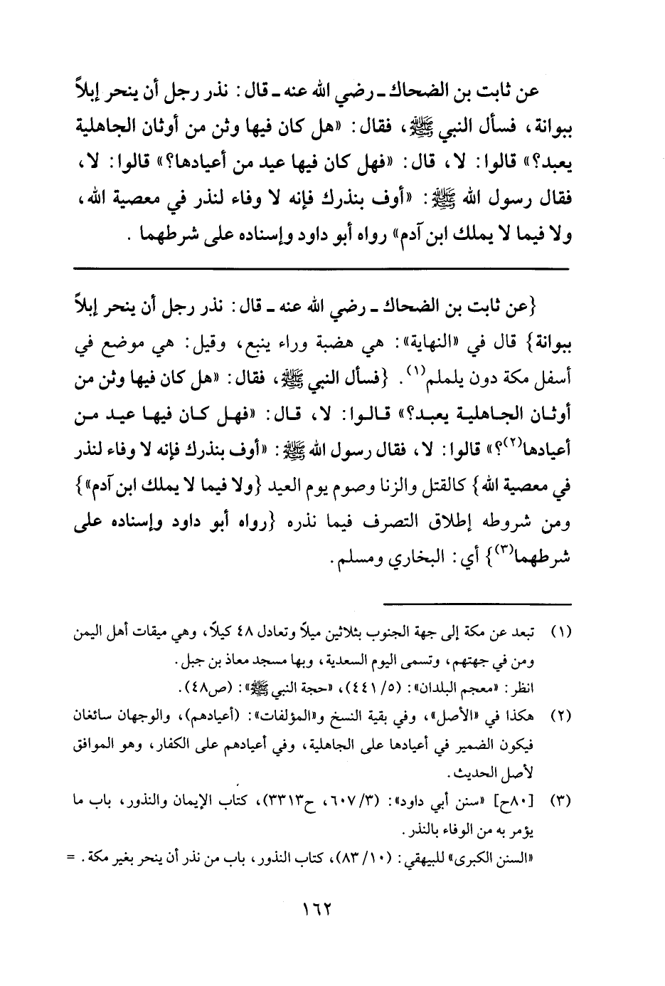 عن ثابت بن الضحاك رضي الله عنه قال: نذر رجل أن ينحر إبلا ببوانة} قال في "النهاية": هي هضبة وراء ينبع، وقيل: هي موضع في أسفل مكة دون يلملم2 " فسأل النبي صلى الله عليه وسلم فقال: هل كان فيها وثن من أوثان الجاهلية يعبد؟ قالوا: لا، قال: فهل كان فيها عيد من أعيادها3؟ قالوا: لا، فقال رسول الله صلى الله عليه وسلم أوف بنذرك فإنه لا وفاء لنذر في معصية الله " كالقتل والزنا وصوم يوم العيد {ولا فيما لا يملك ابن آدم "} ومن شروطه إطلاق التصرف فيما نذره {رواه أبو داود وإسناده على شرطهما4} أي: البخاري ومسلم.
