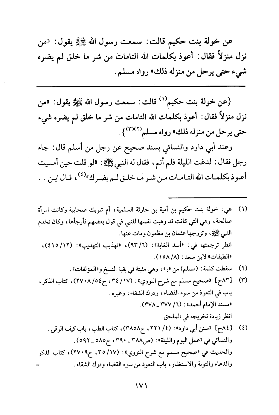 {عن خولة بنت حكيم1 قالت: سمعت رسول الله صلى الله عليه وسلم يقول: " من نزل منزلا فقال: أعوذ بكلمات الله التامات من شر ما خلق لم يضره شيء حتى يرحل من منزله ذلك " رواه مسلم23} .