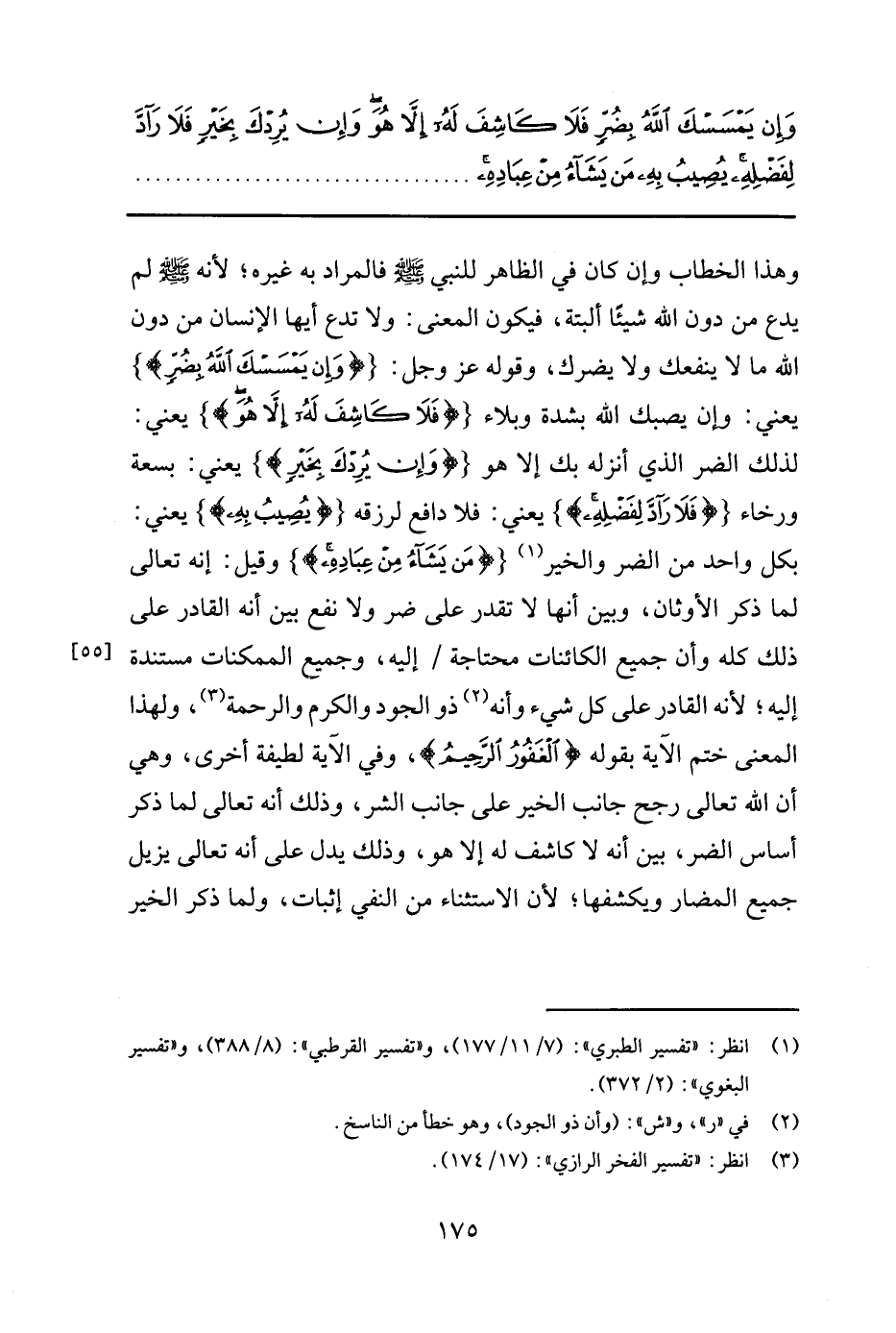 وهذا الخطاب وإن كان في الظاهر للنبي صلى الله عليه وسلم فالمراد به غيره، لأنه صلى الله عليه وسلم لم يدع من دون الله شيئًا ألبتة، فيكون المعنى: ولا تدع أيها الإنسان من دون الله ما لا ينفعك ولا يضرك، وقوله عز وجل {وَإِنْ يَمْسَسْكَ اللَّهُ بِضُرٍّ} 1 يعني: وإن يصبك الله بشدة وبلاء {كَاشِفَ لَهُ إِلاَّ هُوَ} 2 يعني: لذلك الضر الذي أنزله بك إلا هو {وَإِنْ يُرِدْكَ بِخَيْرٍ} يعني: بسعة ورخاء { {فَلا رَادَّ لِفَضْلِهِ} 3} يعني: فلا دافع لرزقه { {يُصِيبُ بِهِ مَنْ يَشَاءُ} يعني: بكل واحد من الضر والخير4 { {مَنْ يَشَاءُ مِنْ عِبَادِهِ} 5} وقيل: إنه تعالى لما ذكر الأوثان، وبين أنها لا تقدر على ضر ولا نفع بين أنه القادر على ذلك كله وأن جميع الكائنات محتاجة إليه، وجميع الممكنات مستندة إليه; لأنه القادر على كل شيء6 وأنه ذو الجود والكرم والرحمة،7 ولهذا المعنى ختم الآية بقوله {الْغَفُورُ الرَّحِيمُ} وفي الآية لطيفة أخرى، وهي أن الله تعالى رجح جانب الخير على جانب الشر، وذلك أنه تعالى لما ذكر أساس الضر، بين أنه لا كاشف له إلا هو، وذلك يدل على أنه تعالى يزيل جميع المضار ويكشفها; لأن الاستثناء من النفي إثبات، ولما ذكر الخير
