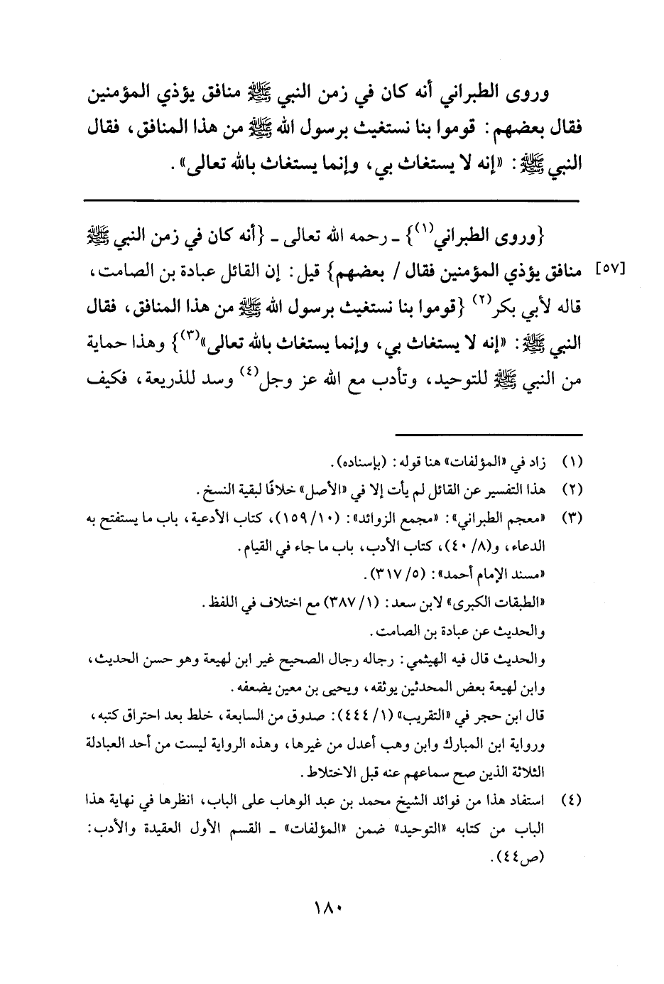 {وروى الطبراني1} -رحمه الله تعالى- {أنه كان في زمن النبي صلى الله عليه وسلم منافق يؤذي المؤمنين فقال بعضهم} قيل: إن القائل عبادة بن الصامت، قاله لأبي بكر2 {قوموا بنا نستغيث برسول الله صلى الله عليه وسلم من هذا المنافق، فقال النبي صلى الله عليه وسلم " إنه لا يستغاث بي، وإنما يستغاث بالله تعالى "3 وهذا حماية من النبي صلى الله عليه وسلم للتوحيد، وتأدب مع الله عز وجل4 وسد للذريعة، فكيف