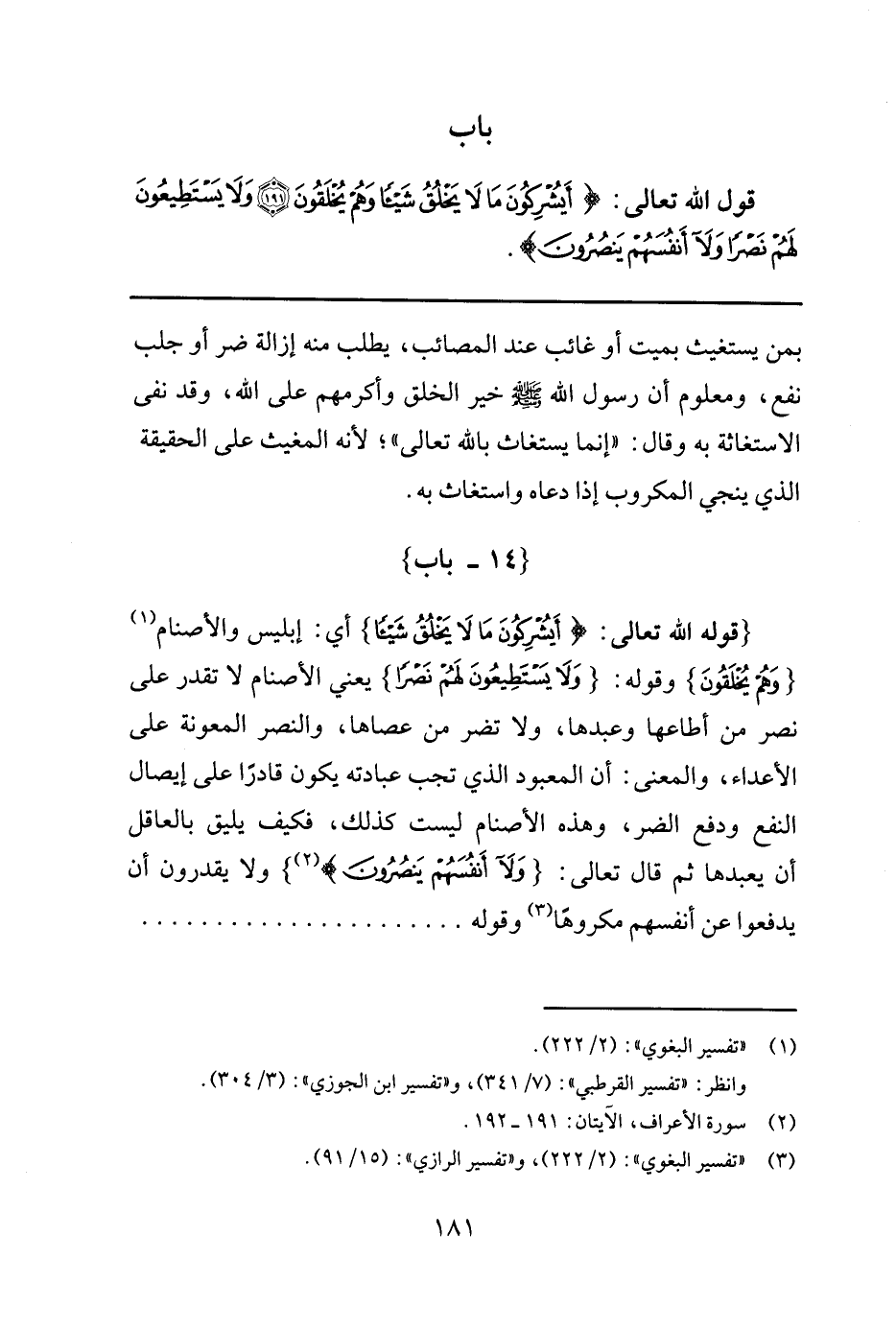 باب قول الله تعالى {أَيُشْرِكُونَ مَا لا يَخْلُقُ شَيْئاً وَهُمْ يُخْلَقُونَ وَلا يَسْتَطِيعُونَ لَهُمْ نَصْراً وَلا أَنْفُسَهُمْ يَنْصُرُونَ} .