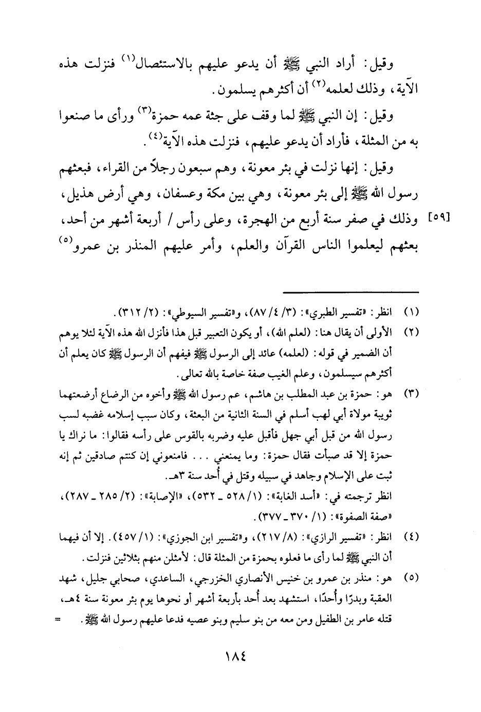 4 انظر: ((تفسير الرازي)) : (8/217) , و ((تفسير ابن الجوزي)) : (1/457) . إلا أن فيهما أن النبي صلى الله عليه وسلم لما رأى ما فعلوه بحمزة من المثلة قال: لأمثلن منهم بثلاثين فنزلت.