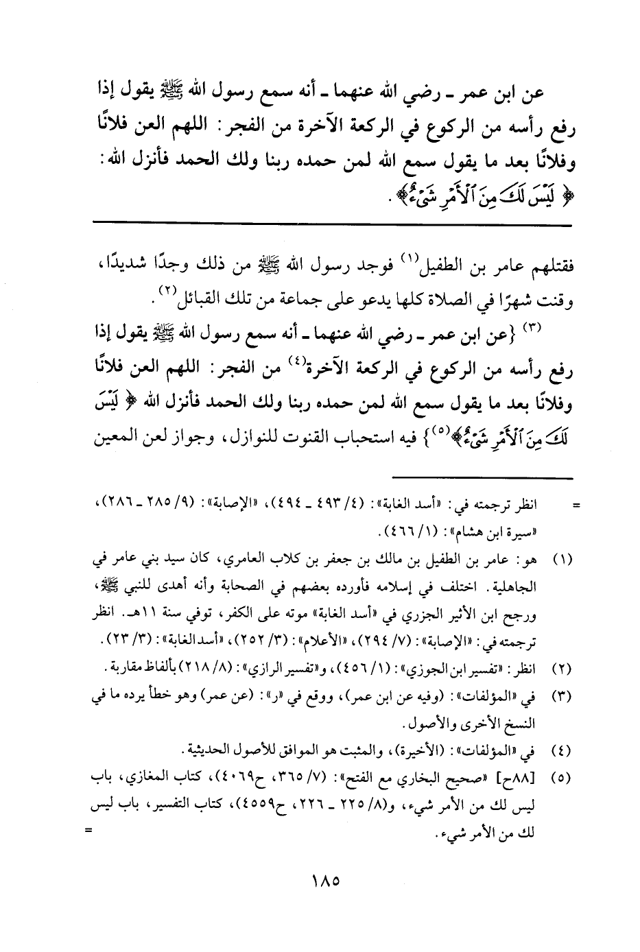 (5) {عن ((ابن عمر -رضي الله عنهما- أنه سمع رسول الله صلى الله عليه وسلم يقول إذا رفع رأسه من الركوع في الركعة الآخرة (6) من الفجر: اللهم العن فلانا وفلانا بعد ما يقول سمع الله لمن حمده ربنا ولك الحمد فأنزل الله {لَيْسَ لَكَ مِنَ الْأَمْرِ شَيْءٌ} (7) (8) فيه استحباب القنوت للنوازل، وجواز لعن المعين