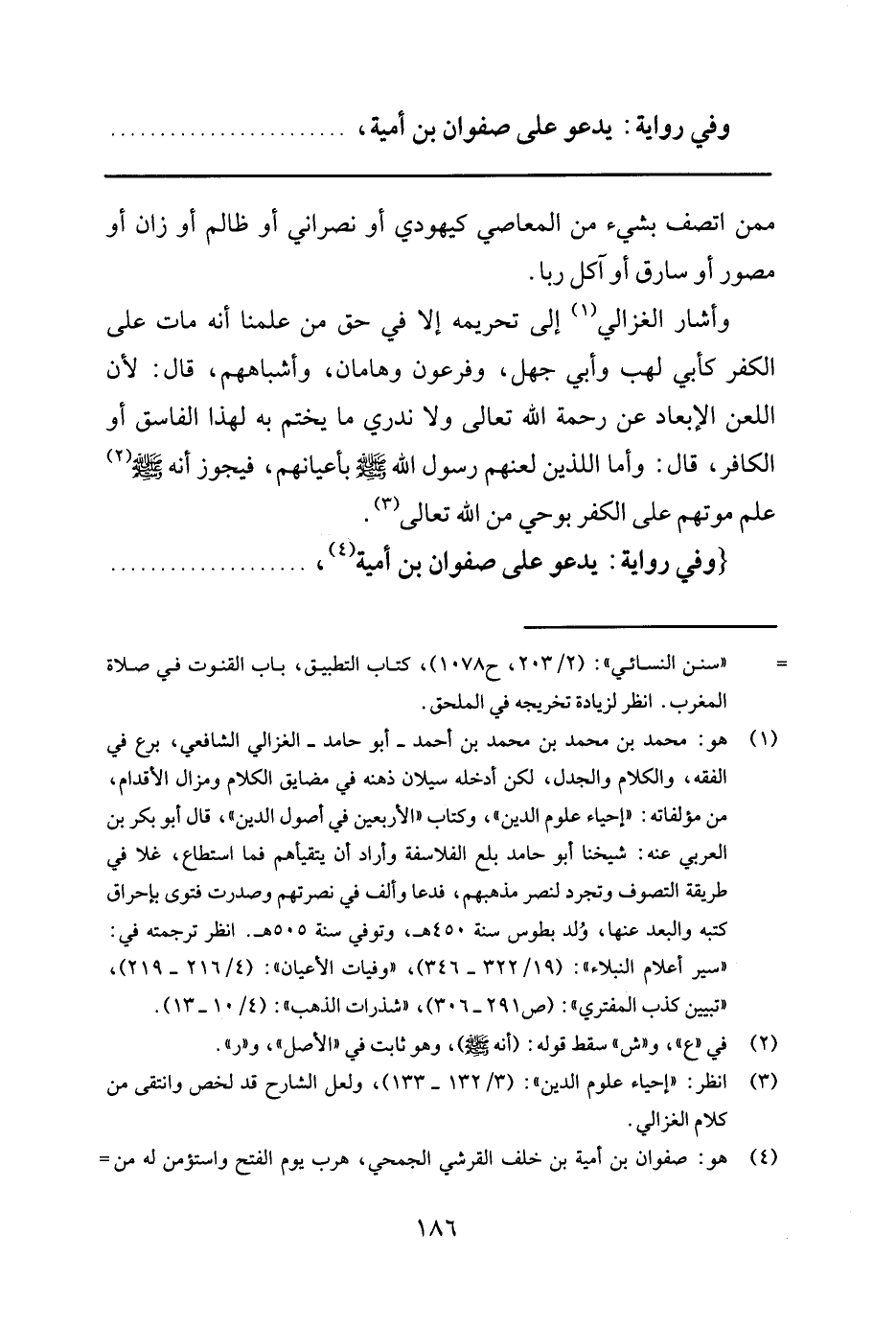 وأشار الغزالي1 إلى تحريمه إلا في حق من علمنا أنه مات على الكفر كأبي لهب وأبي جهل، وفرعون وهامان، وأشباههم قال: لأن اللعن الإبعاد عن رحمة الله تعالى ولا ندري ما يختم به لهذا الفاسق أو الكافر، قال: وأما الذين لعنهم رسول الله صلى الله عليه وسلم بأعينهم، فيجوز أنه صلى الله عليه وسلم 2 علم موتهم على الكفر بوحي من الله تعالى3.