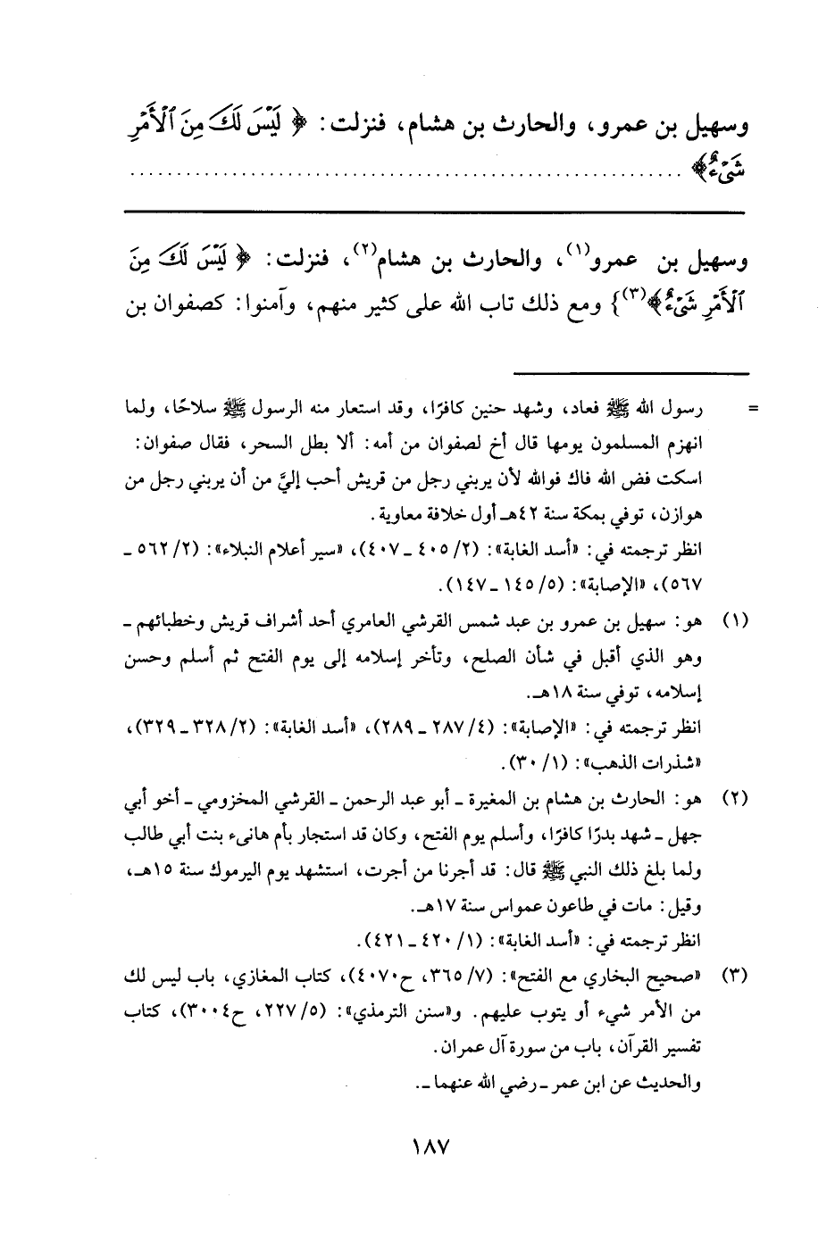 وسهيل بن عمرو (1) ، والحارث بن هشام (2) ، فنزلت: {لَيْسَ لَكَ مِنَ الْأَمْرِ شَيْءٌ} (3) (4) } ومع ذلك تاب الله على كثير منهم، وآمنوا: كصفوان بن
