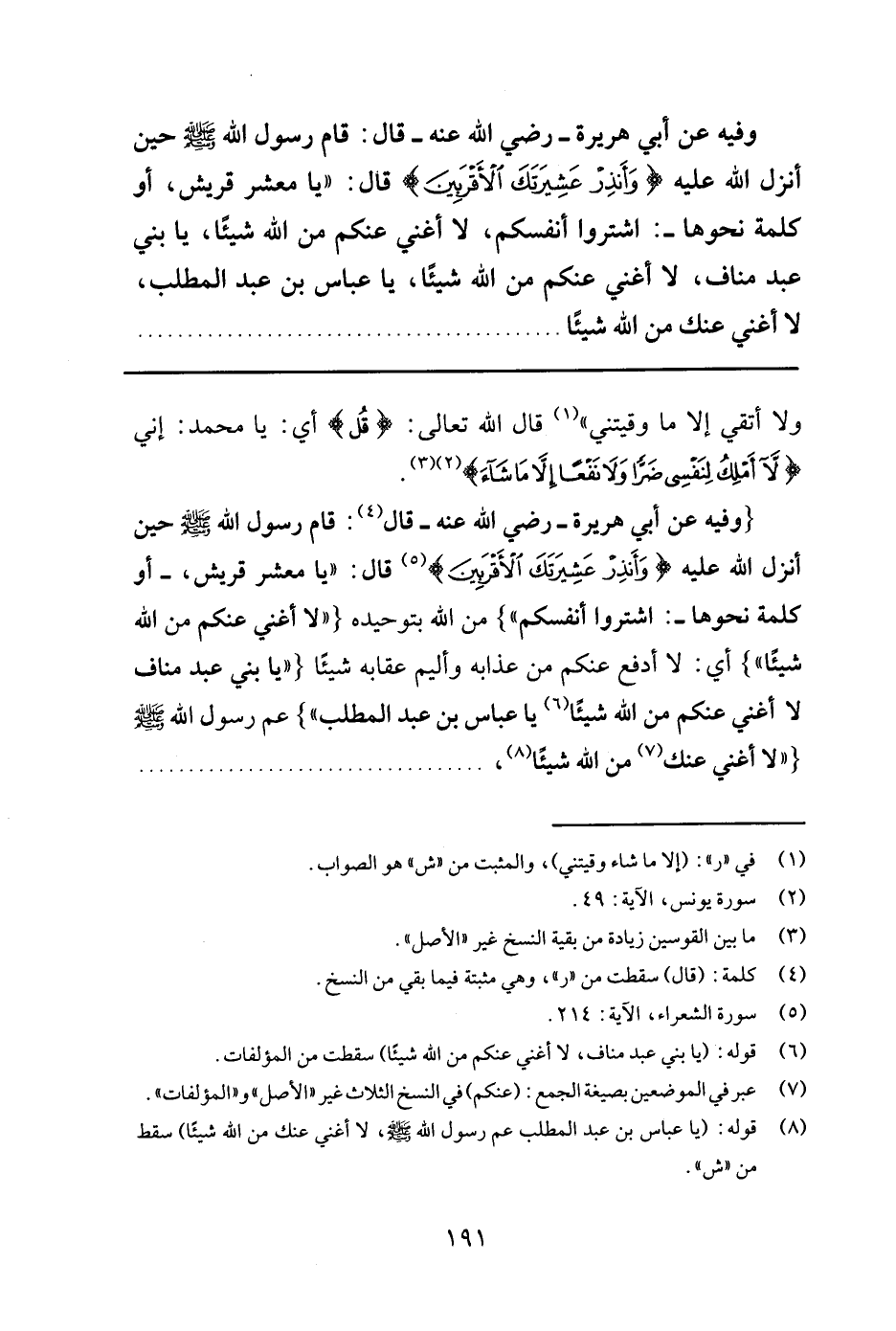 {وفيه عن أبي هريرة رضي الله عنه قال4 قام رسول الله صلى الله عليه وسلم حين أنزل الله عليه {وَأَنْذِرْ عَشِيرَتَكَ الْأَقْرَبِينَ} 5 قال: " يا معشر قريش، -أو كلمة نحوها-: اشتروا أنفسكم {"من الله بتوحيده " لا أغني عنكم من الله شيئًا "6 أي: لا أدفع عنكم من عذابه وأليم عقابه شيئًا " يا بني عبد مناف لا أغني عنكم من الله شيئًا7 يا عباس بن عبد المطلب " عم رسول الله صلى الله عليه وسلم " لا أعني عنك8 من الله شيئًا 9