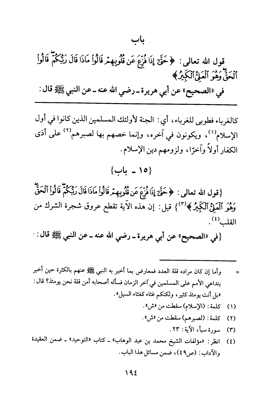 (4) انظر: ((مؤلفات الشيخ محمد بن عبد الوهاب)) -كتاب ((التوحيد)) - ضمن العقيدة والآداب: (ص 49) , ضمن مسائل هذا الباب.