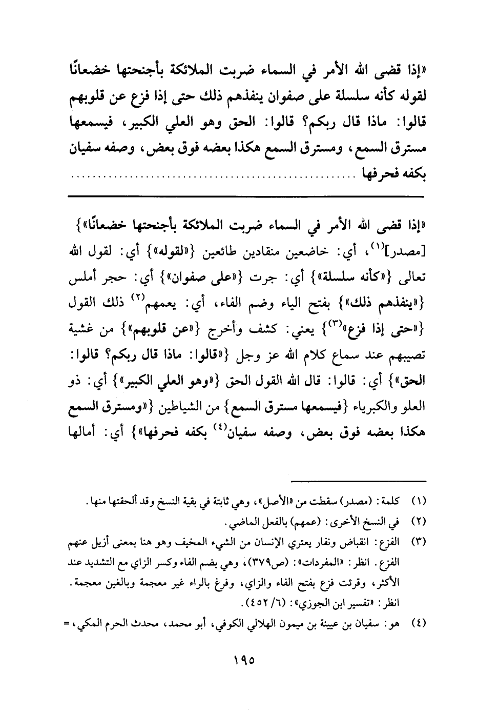 " إذا قضى الله الأمر في السماء ضربت الملائكة بأجنحتها خضعانا لقوله كأنه سلسلة على صفوان ينفذهم ذلك حتى إذا فزع عن قلوبهم قالوا: ماذا قال ربكم؟ قالوا: الحق وهو العلي الكبير، فيسمعها مسترق السمع، ومسترق السمع هكذا بعضه فوق بعض، وصفه سفيان بكفه فحرفها