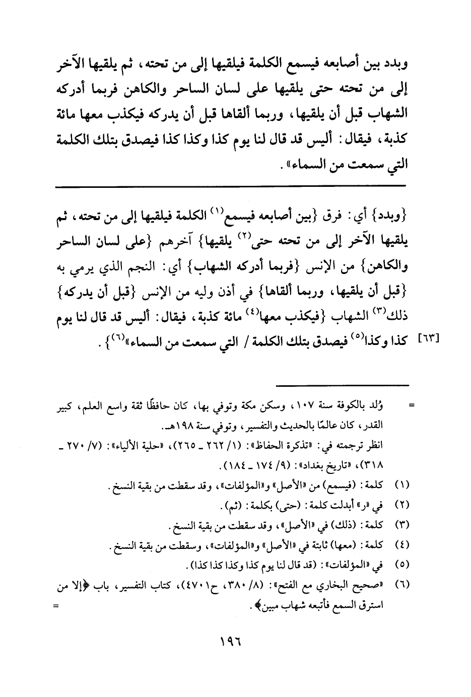 (6) ((صحيح البخاري مع الفتح)) : (8/380, ح 4701) , كتاب التفسير, باب /4 إلا من استرق السمع فأتبعه شهاب مبين /4. والحديث -أيضا- في ((سنن الترمذي ((: (5/362, ح 3223) , كتاب التفسير, باب ومن سورة سبأ. و ((سنن ابن ماجه)) : (1/69-70, ح 194) , المقدمة, باب فيما أنكرت الجهمية. و ((صحيح ابن حبان)) : ((الإحسان)) : (1/122, ح 36) .