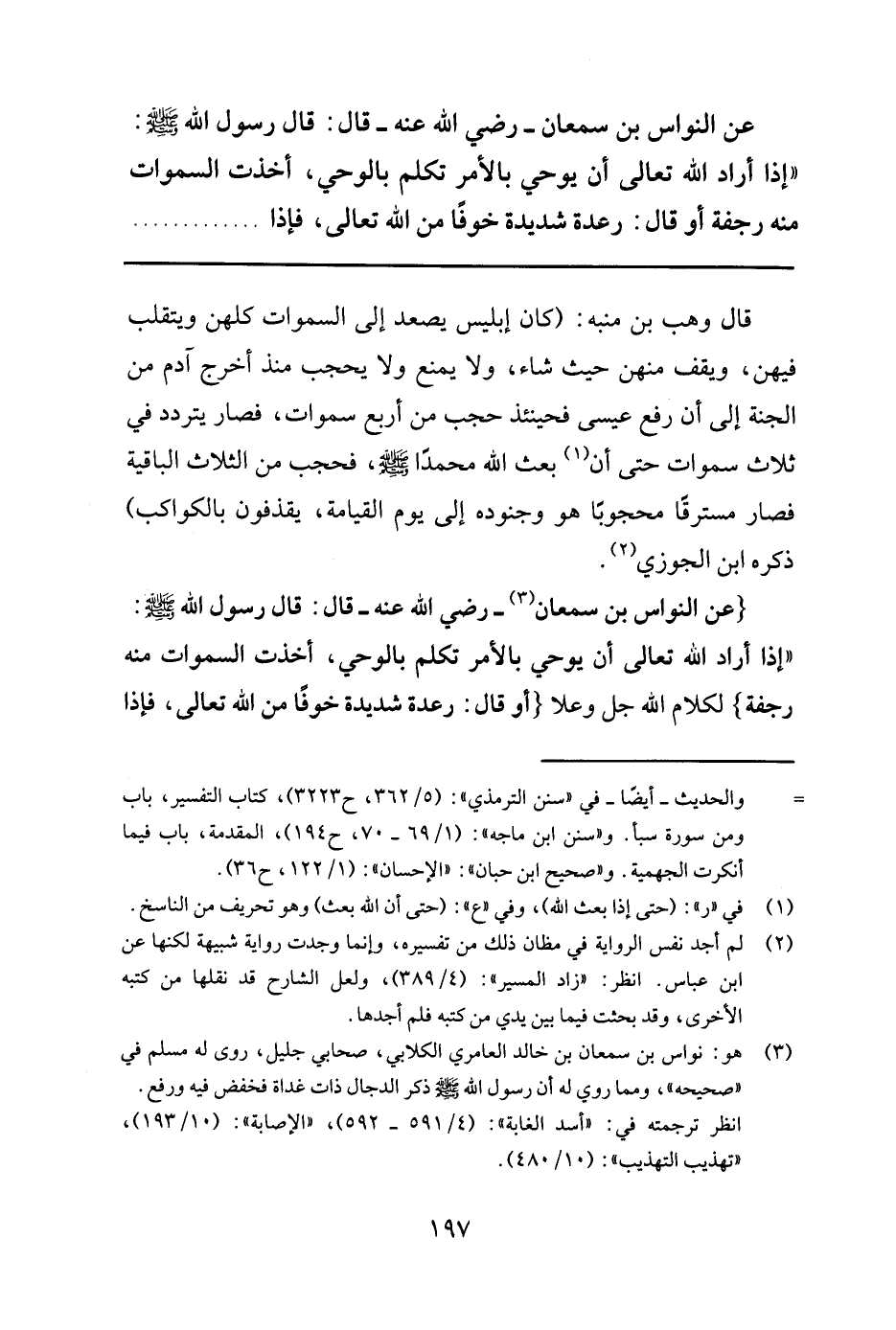 {عن النواس بن سمعان3 رضي الله عنه قال: قال رسول الله صلى الله عليه وسلم " إذا أراد الله تعالى أن يوحي بالأمر تكلم بالوحي، أخذت السماوات منه رجفة " لكلام الله جل وعلا " أو قال: رعدة شديدة خوفا من الله تعالى، فإذا