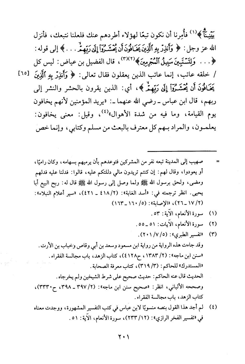 (4) ((تفسير الطبري)) : (5/ 7/ 201) . وقد جاءت هذه الرو، الآية من رو، الآية ابن مسعود وسعد بن أبي وقاص وخباب بن الأرت. ((سنن ابن ماجه)) : (2/ 1383, ح 4128) , كتاب الزهد, باب مجالسة الفقراء. ((المستدرك)) للحاكم: (3/ 319) , كتاب معرفة الصحابة. الحديث قال عنه الحاكم: حديث صحيح على شرط الشيخين ولم يخرجاه. وصححه الألباني, انظر: ((صحيح سنن ابن ماجه)) : (2/ 397- 398, ح 3330) , كتاب الزهد, باب مجالسة الفقراء.