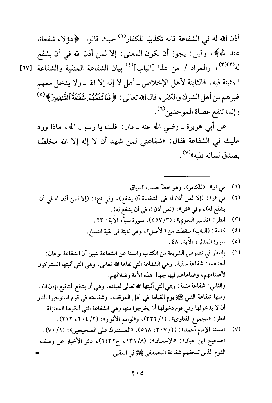 (7) بالنظر في نصوص الشريعة من الكتاب والسنة عن الشفاعة يتبين أن الشفاعة نوعان: أحدهما: شفاعة منفية: وهي الشفاعة التي نفاها الله تعالى, وهي التي أثبتها المشركون لأصنامهم, وضاهاهم فيها جهال هذه الأمة وضلالهم. والثاني: شفاعة مثبتة: وهي التي أثبتها الله تعالى لعباده, وهي أن يشفع الشفيع بإذن الله, ومنها شفاعة النبي - صلى الله عليه وسلم - يوم القيامة في أهل الموقف, وشفاعته في قوم استوجبوا النار أن لا يدخلوها وفي قوم دخلوها أن يخرجوا منها وهي الشفاعة التي أنكرها المعتزلة. انظر: ((مجموع الفتاوى)) : (1/ 332) , و ((لوامع الأنوار)) : (2/ 204, 212) .