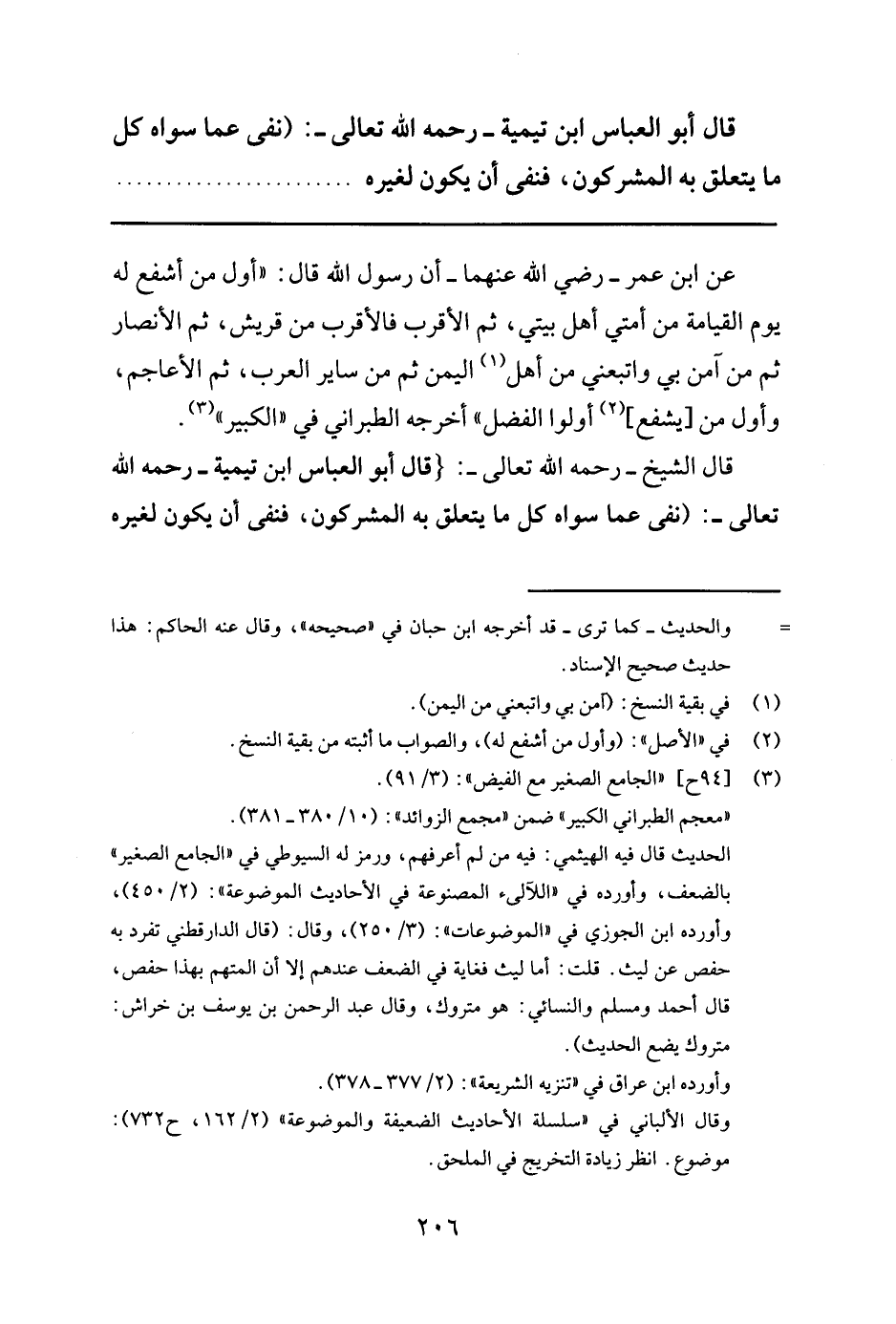 عن ابن عمر -رضي الله عنهما- أن رسول الله قال: " أول من أشفع له يوم القيامة من أمتي أهل بيتي، ثم الأقرب فالأقرب من قريش، ثم الأنصار ثم من آمن بي واتبعني من أهل1 اليمن ثم من ساير العرب، ثم الأعاجم، وأول من [يشفع] 2 أولوا الفضل " أخرجه الطبراني في "الكبير"3. قال الشيخ -رحمه الله تعالى-: {قال أبو العباس ابن تيمية -رحمه الله تعالى-: (نفى عما سواه كل ما يتعلق به المشركون، فنفى أن يكون لغيره