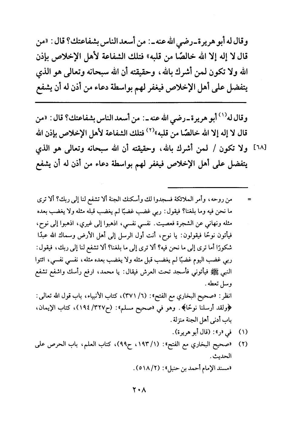وقال له أبو هريرة رضي الله عنه من أسعد الناس بشفاعتك؟ قال: " من قال لا إله إلا الله خالصا من قلبه " فتلك الشفاعة لأهل الإخلاص بإذن الله ولا تكون لمن أشرك بالله، وحقيقته أن الله سبحانه وتعالى هو الذي يتفضل على أهل الإخلاص فيغفر لهم بواسطة دعاء من أذن له أن يشفع