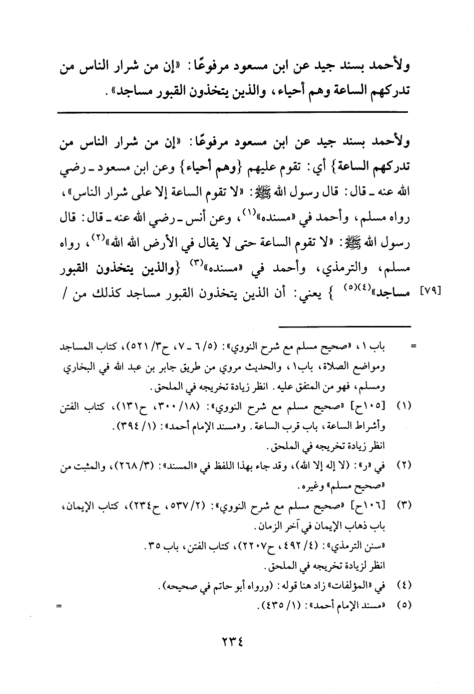 ولأحمد بسند جيد عن ابن مسعود مرفوعا: " إن من شرار الناس من تدركهم الساعة " أي: تقوم عليهم {وهم أحياء} وعن ابن مسعود رضي الله عنهقال: قال رسول الله صلى الله عليه وسلم " لا تقوم الساعة إلا على شرار الناس " رواه مسلم، وأحمد في"مسنده" 1، وعن أنس رضي الله عنهقال: قال رسول الله صلى الله عليه وسلم " لا تقوم الساعة حتى لا يقال في الأرض الله الله "2 رواه مسلم، والترمذي، وأحمد في"مسنده" 3 {والذين يتخذون القبور مساجد" 45 يعني: أن الذين يتخذون القبور مساجد كذلك من