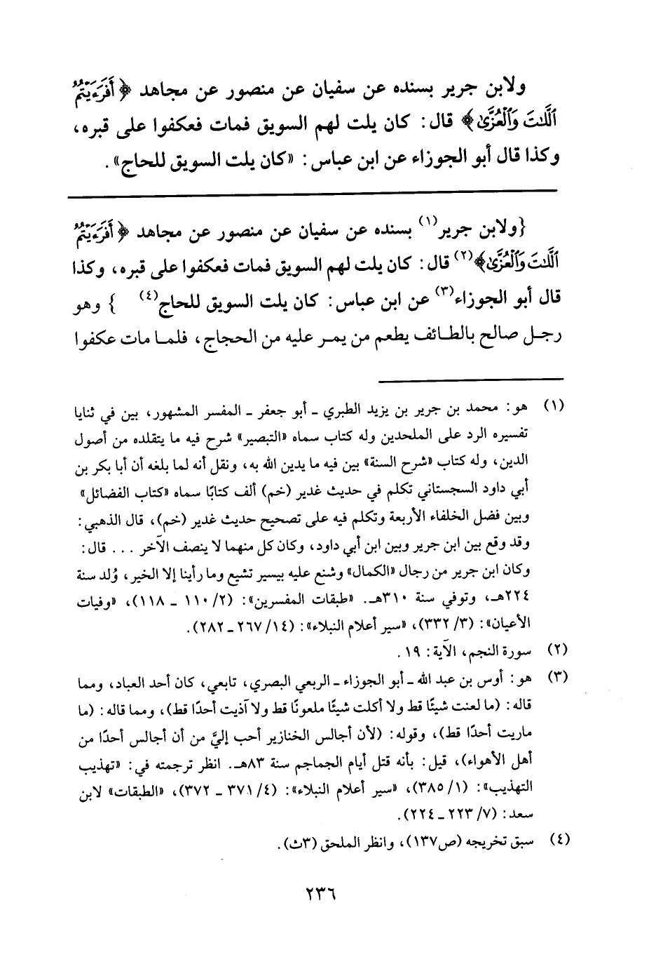 {ولابن جرير1 بسنده عن سفيان عن منصور عن مجاهد {أَفَرَأَيْتُمُ اللاَّتَ وَالْعُزَّى} 2 قال: كان يلت لهم السويق فمات فعكفوا على قبره، وكذا قال أبو الجوزاء3 عن ابن عباس: كان يلت السويق للحاج4} وهو رجل صالح بالطائف يطعم من يمر عليه من الحجاج، فلما مات عكفوا