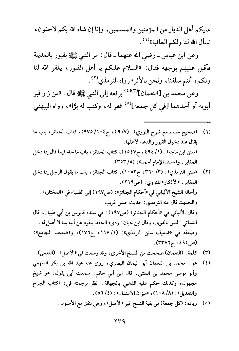 وعن ابن عباس -رضي الله عنهما- قال: مر النبي صلى الله عليه وسلم بقبور بالمدينة فأقبل عليهم بوجهه فقال: " السلام عليكم يا أهل القبور، يغفر الله لنا ولكم، أنتم سلفنا، ونحن بالأثر "2 رواه الترمذي.3 وعن محمد بن [النعمان] 45 يرفعه إلى النبي صلى الله عليه وسلم قال: " من زار قبر أبويه أو أحدهما [في كل جمعة] 6 غفر له، وكتب له برًّا " رواه البيهقي