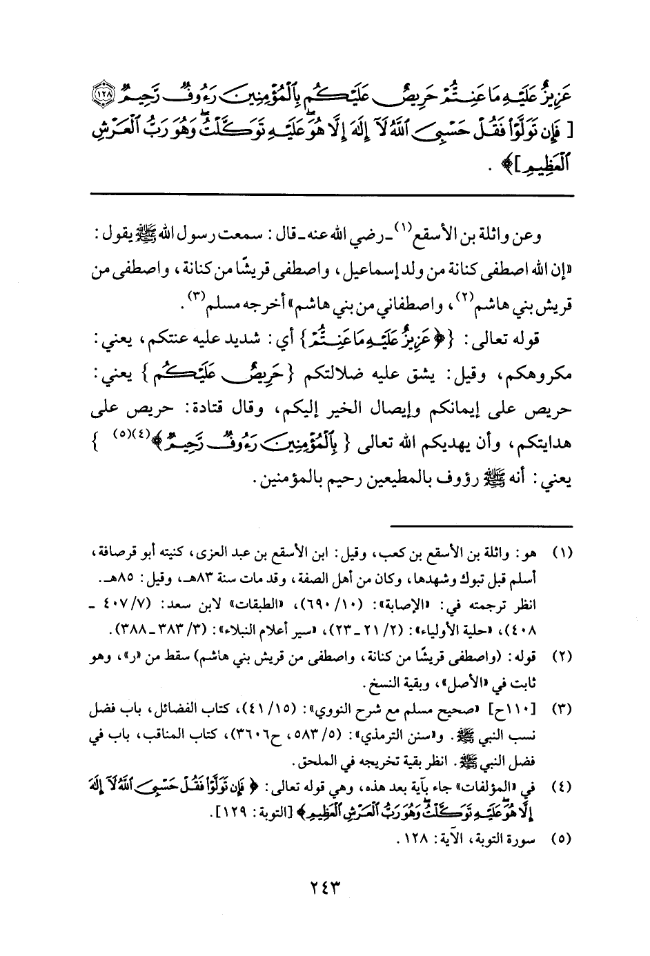 وعن واثلة بن الأسقع1 رضي الله عنه قال: سمعت رسول الله صلى الله عليه وسلم يقول: "إن الله اصطفى كنانة من ولد إسماعيل، واصطفى قريشا من كنانة، واصطفى من قريش بني هاشم،2 واصطفاني من بني هاشم" أخرجه مسلم.3 قوله تعالى: {عَزِيزٌ عَلَيْهِ مَا عَنِتُّمْ} أي: شديد عليه عنتكم، يعني: مكروهكم، وقيل: يشق عليه ضلالتكم { (حَرِيصٌ عَلَيْكُمْ} يعني: حريص على إيمانكم وإيصال الخير إليكم، وقال قتادة: حريص على هدايتكم، وأن يهديكم الله تعالى {بِالْمُؤْمِنِينَ رَؤُوفٌ رَحِيمٌ} 4يعني: أنه صلى الله عليه وسلم رءوف بالمطيعين رحيم بالمؤمنين.