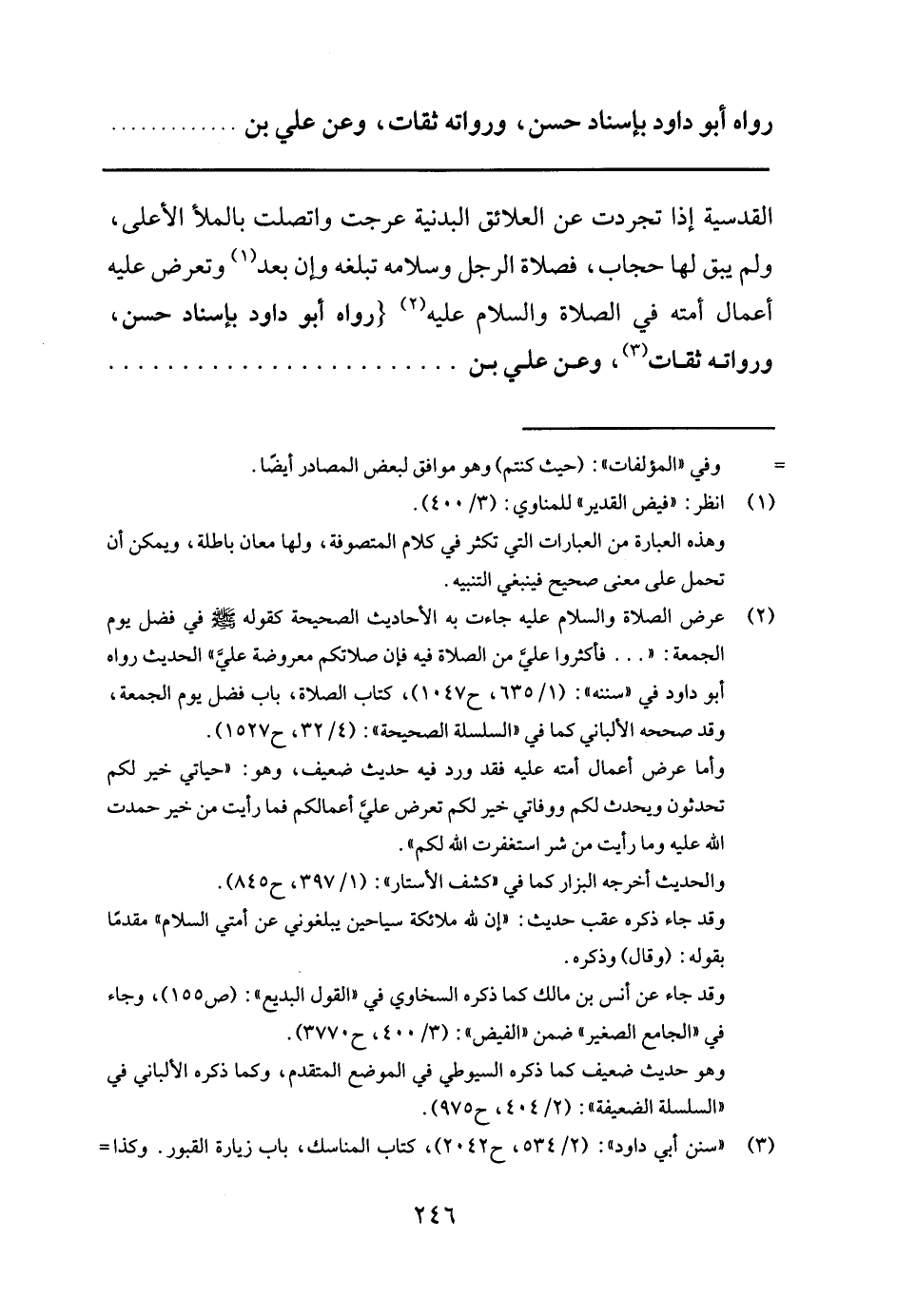 القدسية إذا تجردت عن العلائق البدنية عرجت واتصلت بالملأ الأعلى، ولم يبق لها حجاب، فصلاة الرجل وسلامه تبلغه وإن بعد1 وتعرض عليه أعمال أمته في الصلاة والسلام عليه2 {رواه أبو داود بإسناد حسن، ورواته ثقات،3 وعن علي بن.